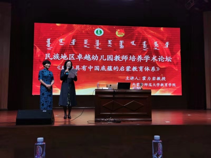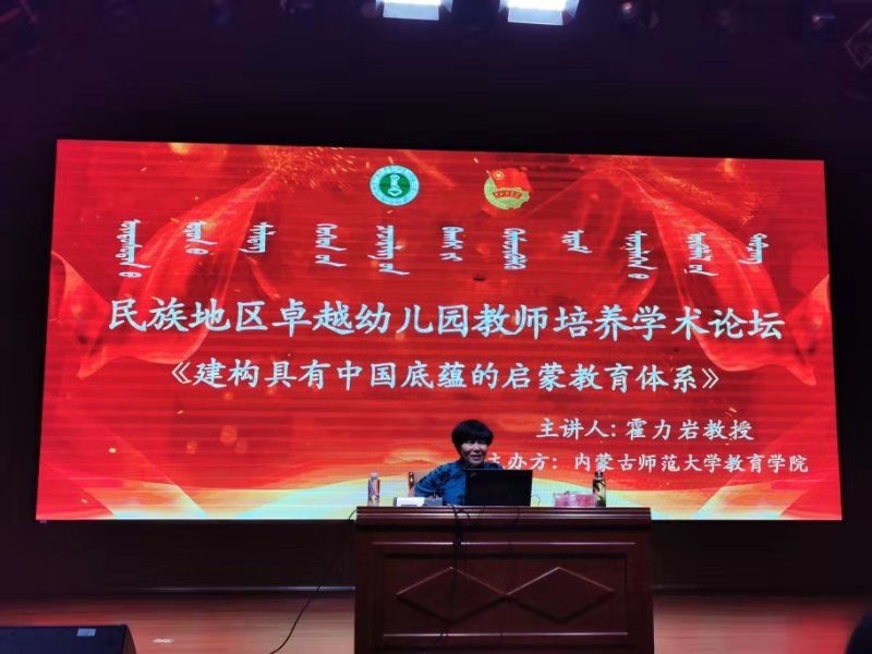 9月21日上午,beat365官网在学校盛乐校区图书馆二楼报告厅成功举办了“民族地区卓越幼儿园教师培养学术论坛”。本次论坛的主讲人是北京师范大学教育学部学前教育研究所的霍力岩教授,论坛主题为“构建有中国底蕴的启蒙教育体系——兼谈迈向‘深化改革规范发展’之‘办好学前教育’新时代”。论坛由beat365正版唯一官网民族地区卓越幼儿园教师培养项目负责人朱晓红教授主持,学院相关教师、本科生、研究生以及基层幼儿园领导和教师代表等参加了本次论坛。