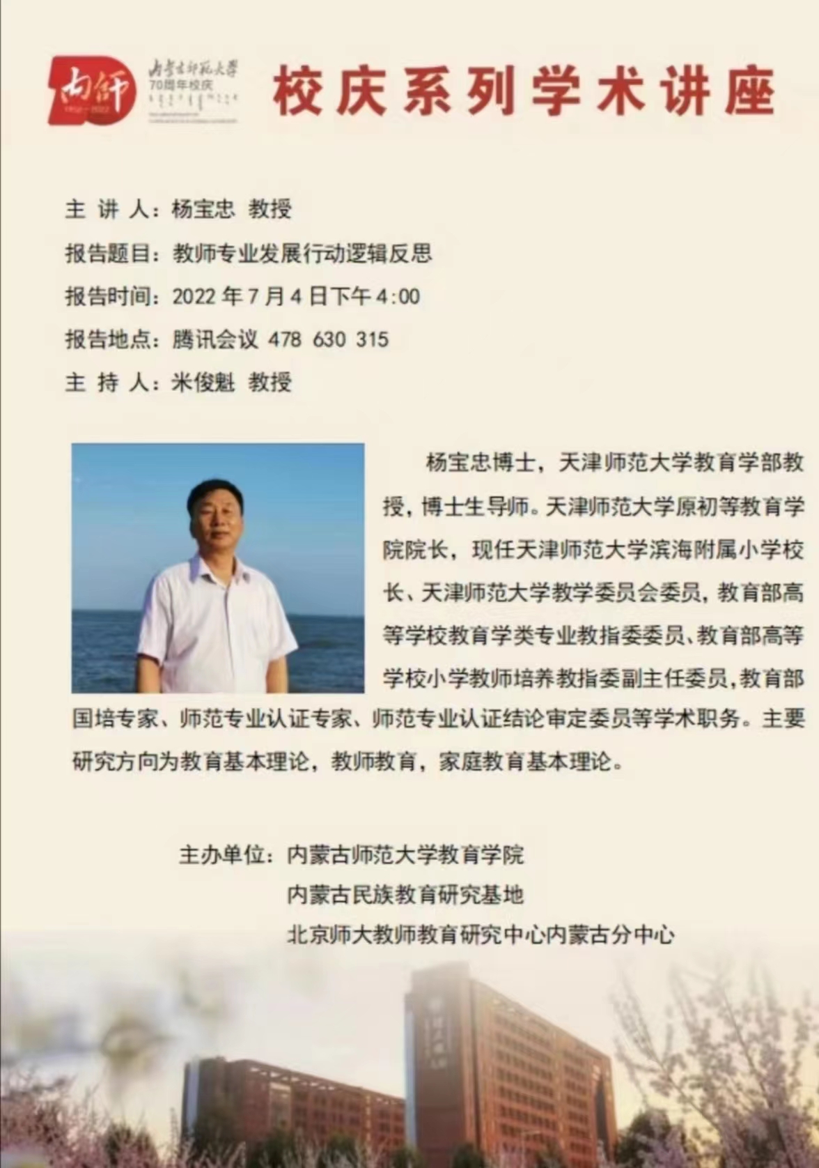 2022年7月4日,天津师范大学教育学部博士生导师、杨宝忠教授,通过腾讯视频会议,线上为beat365正版唯一官网全体师生,做了题为“教师专业发展行动逻辑反思”的学术报告。报告会由米俊魁院长主持,小学教育专业200多位师生聆听了学术报告。