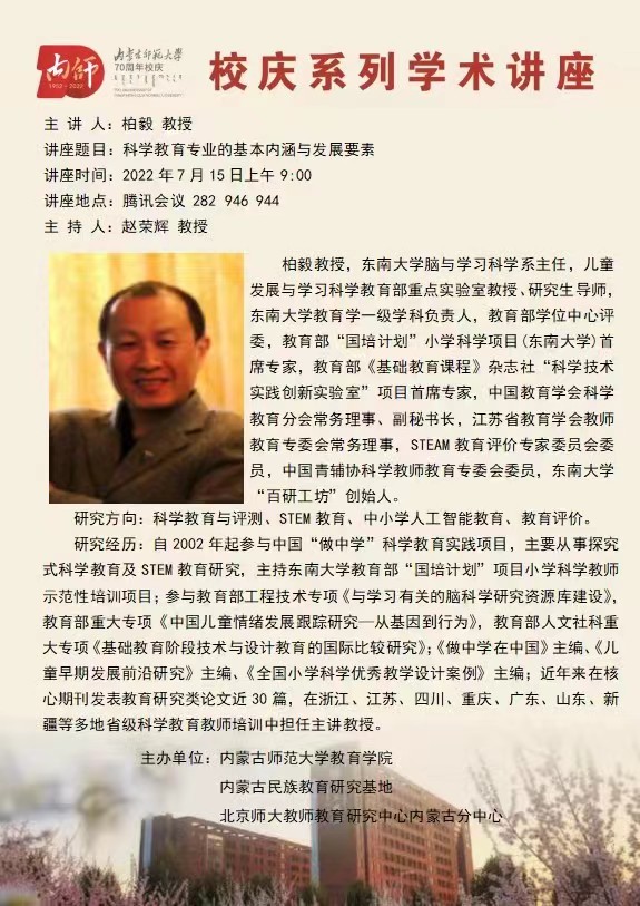 715日上午,beat365官网邀请东南大学脑与学习科学系主任柏毅教授,为beat365正版唯一官网全体师生通过腾讯视频会议,做了题为“教育科学专业的基本内涵与发展要求”的学术报告。报告由beat365正版唯一官网、内蒙古民族教育基地、北师大教师教育研究中心内蒙古分中心主办,赵荣辉副院长主持,小学教育专业300多位师生聆听了报告。