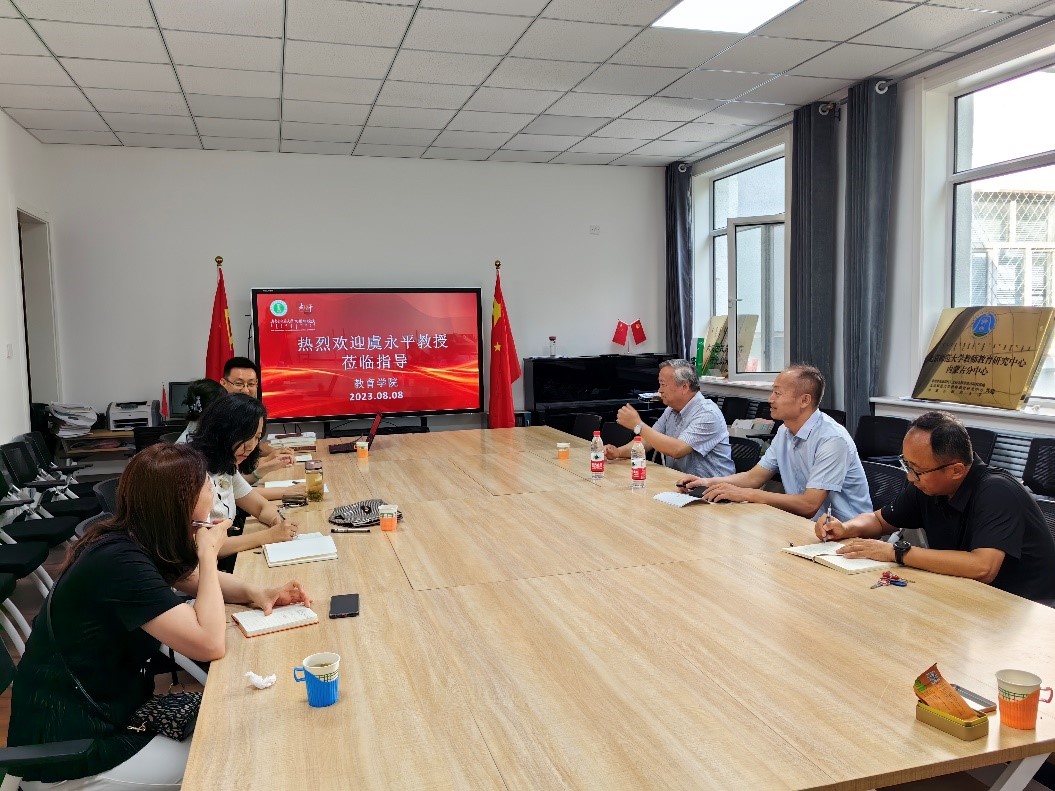 8月8日上午,南京师范大学教育科学学院虞永平教授应beat365官网邀请,来校座谈交流。虞永平教授兼任教育部幼儿园教师培养教学指导委员会主任委员、教育部基础教育教学指导委员会学前教育保教指导专委会副主任委员、普通高等学校师范类专业认证专家委员会委员、江苏省陈鹤琴教育思想研究会理事长。座谈会由院长赵荣辉教授主持。副院长边琦、杨日飞,各系部主任及学前与特殊教育系部分教师参加了座谈交流。