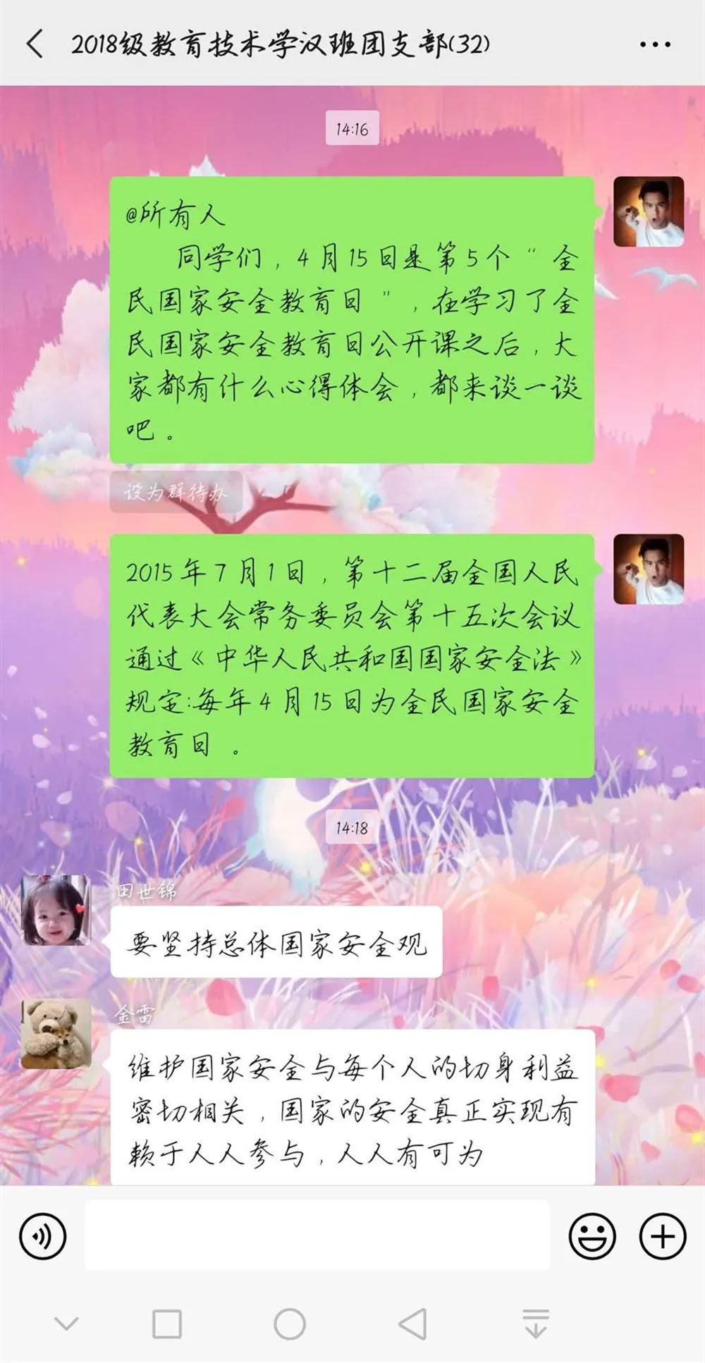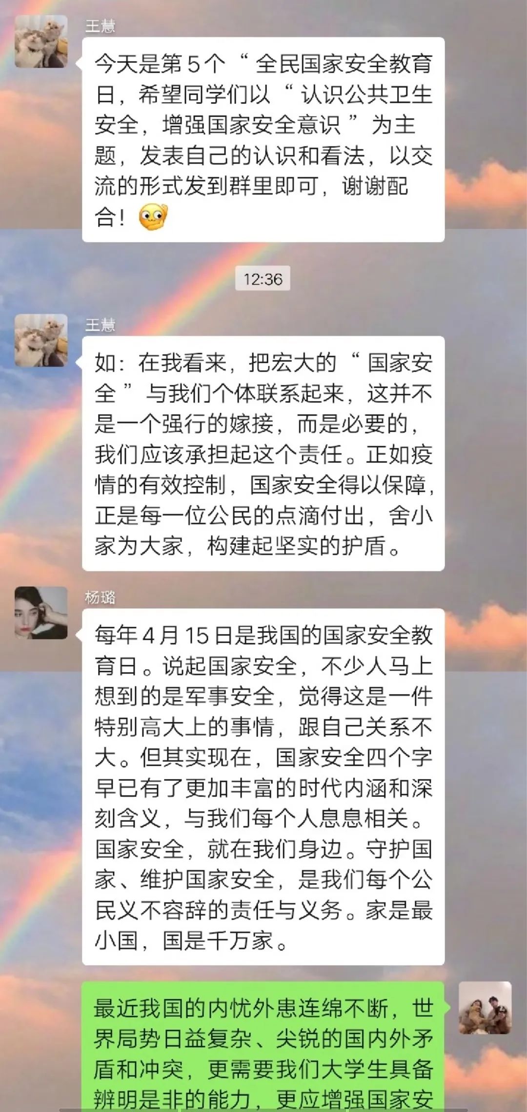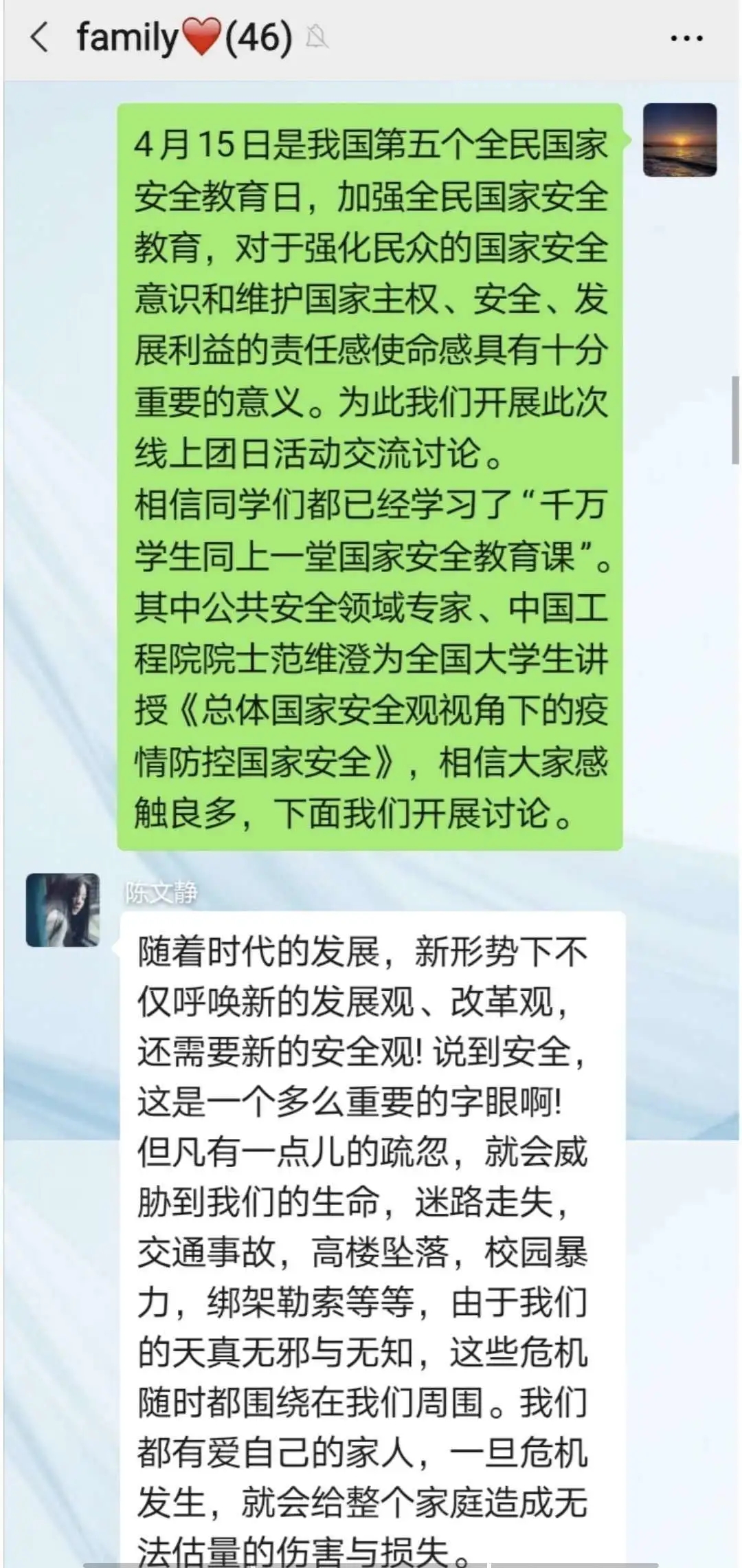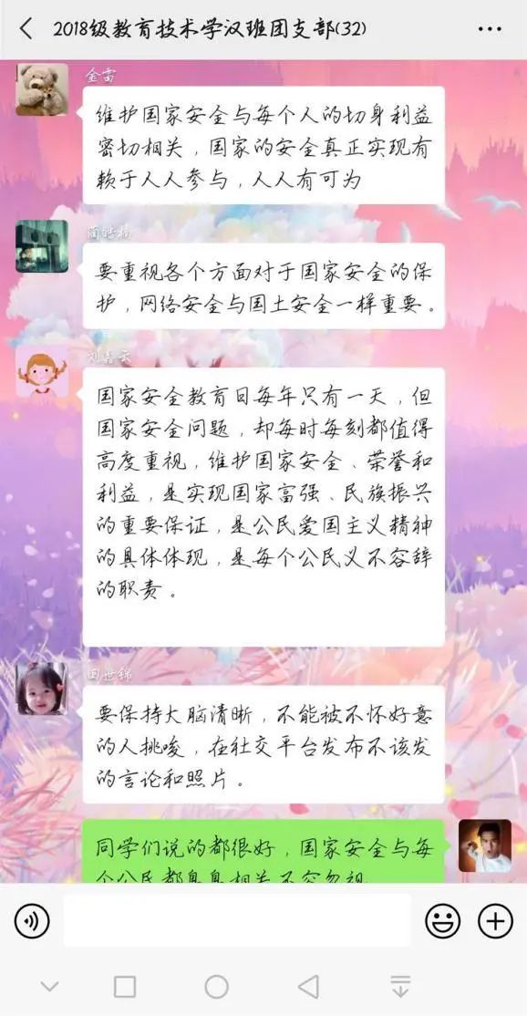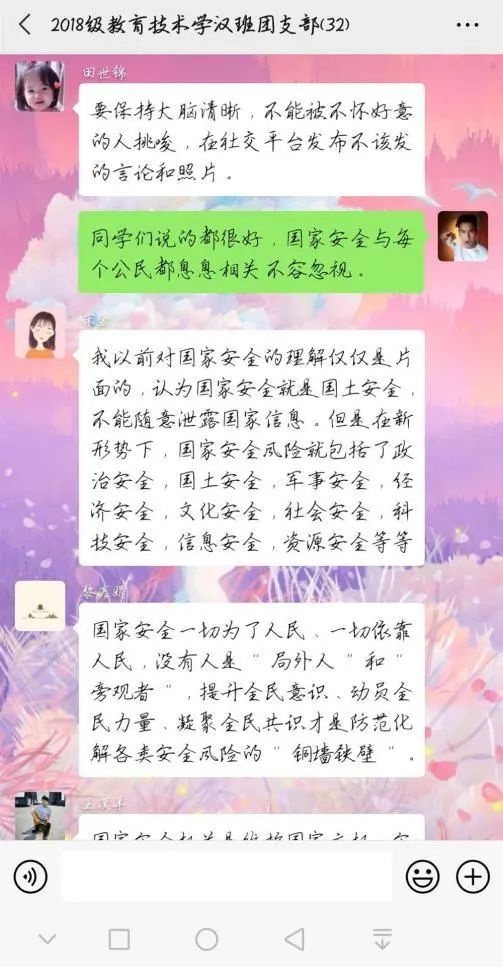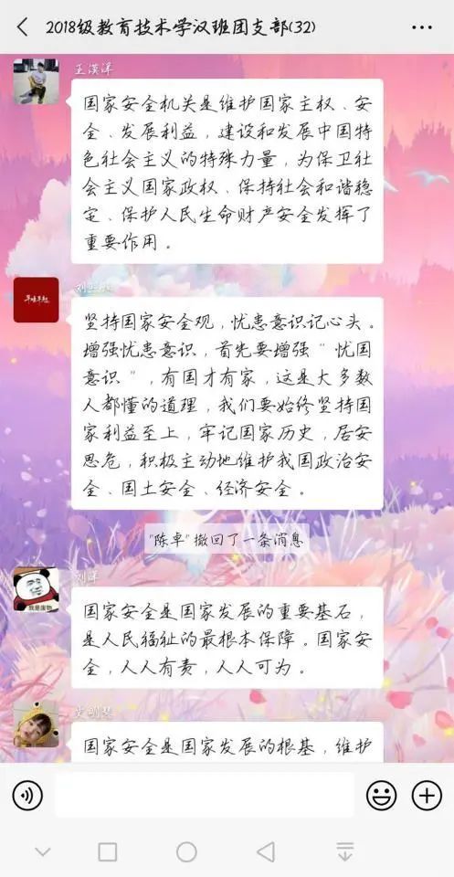 为深入学习贯彻以习近平同志为核心的党中央关于疫情防控工作的决策部署,引导学生将总体国家安全观贯穿抗疫全过程,履行应对突发公共事件的职责义务,提升维护国家安全的自觉性和主动性,beat365官网各团支部举办以“深入认识公共卫生安全,增强国家安全意识”为主题的团日活动。通过线上交流、分享心得的方式,加强同学们对国家安全的认识,使国家安全教育深入到每个人心中。