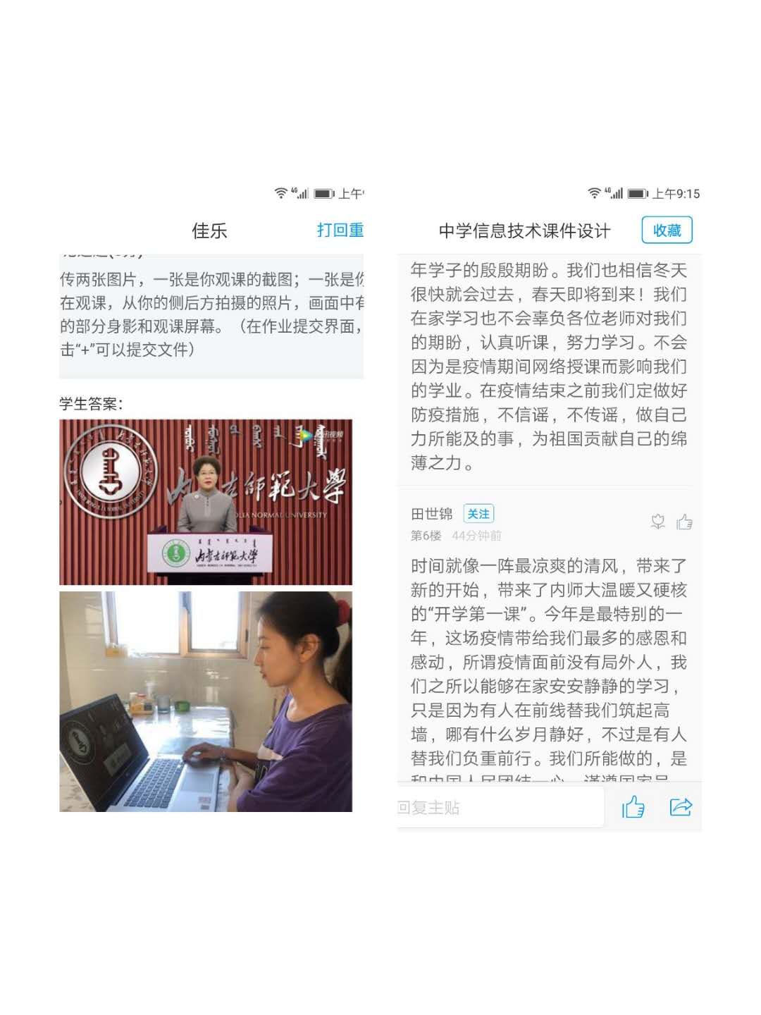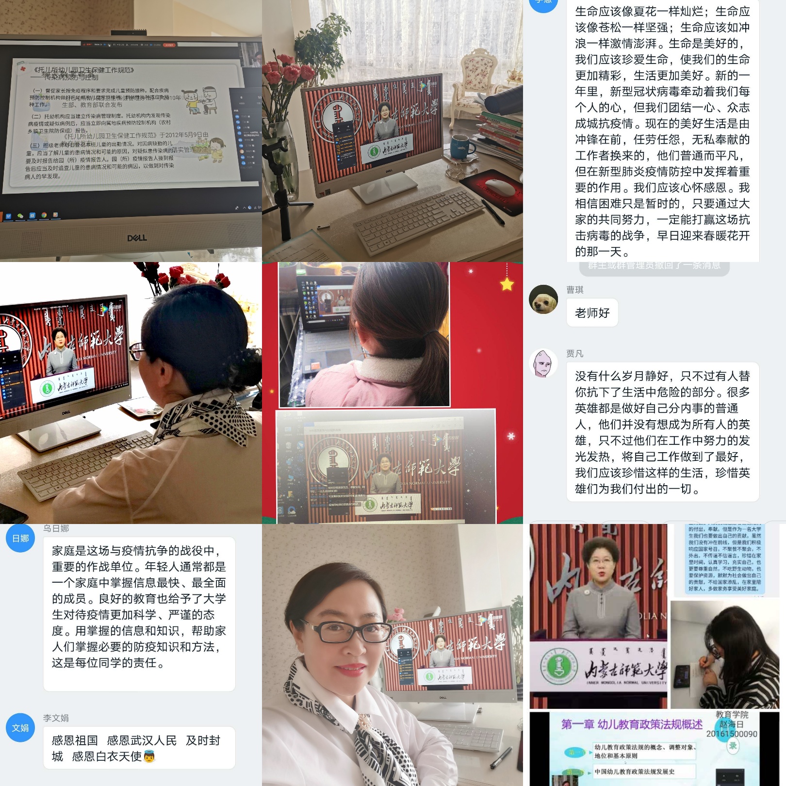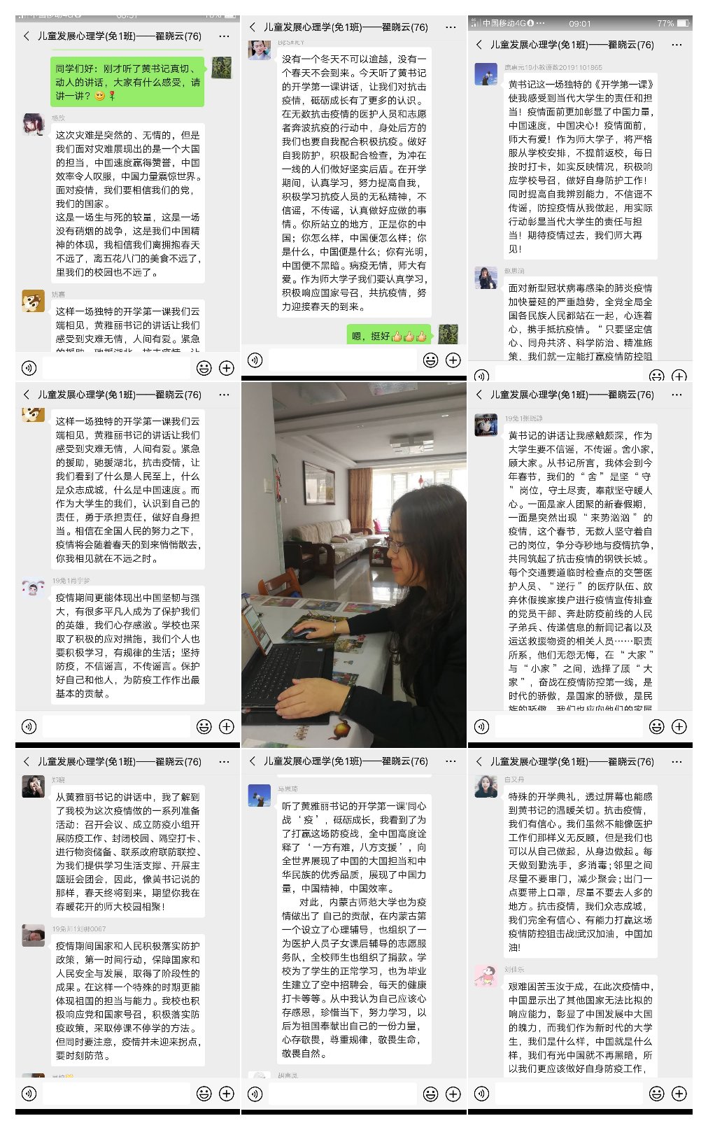依据beat365官网本科生在线教学工作开学安排,17级教育技术学汉班、19级小学教育免师一班、19级小学教育语文班、18级教育技术学蒙班、18级小学教育语文班、19级教育学类二班、19级教育技术学班、19级教育学类一班、18级学前教育班(合作教学)共九个班级在任课教师带领下提前上课并关注直播平台,准时一同认真学习黄雅丽书记讲授的《开学第一课》后,师生进行互动,任课教师就黄书记讲话中中国人民在疫情防控中展现出的中国力量、展现的责任大国形象开展思政教育,就黄书记对师大青年学子的殷殷寄语与同学们进行研讨,并将开展情况反馈至beat365官网教务办。