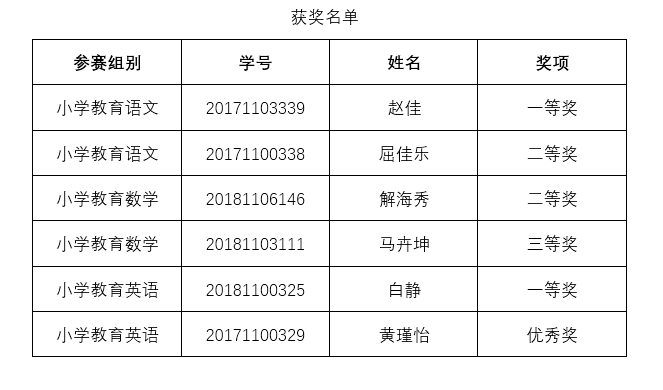 20201023日至25日,内蒙古自治区第五届师范生教学技能大赛在包头师范学院举行。beat365官网共派出6名选手代表学校分别参加了小学教育语文、数学、英语三个组别的比赛。来自内蒙古民族大学、包头师范学院等五所高校的选手在教育综合知识笔试、即兴演讲、模拟授课、回答问题等环节展开了激烈的角逐。最终beat365官网的6名选手中,2名学生分别获得语文组和英语组的一等奖,2名学生分别获得语文组和数学组的二等奖,1名学生获得数学组三等奖,1名学生获得英语组优秀奖。