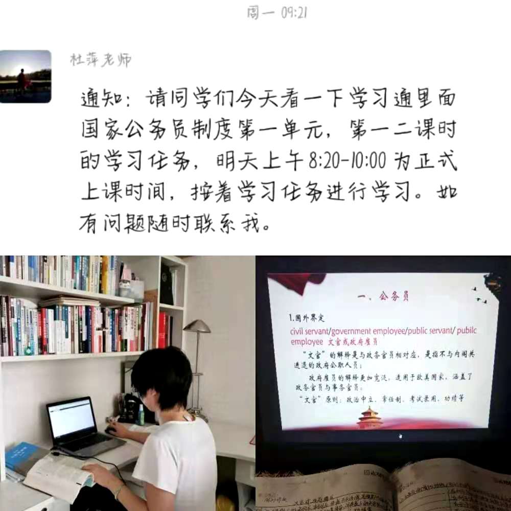 老师采用了微信与学习通平台相结合的方式在线教学,不仅为我们准备了丰富的学习资源,而且还为我们录制了边放课件边讲解的视频材料,逻辑严谨,结构清晰,为同学们的学习创造了良好的条件。杜老师虽然没有采取直播的方式授课,但是这种模式也给同学们创造了自主学习的机会,在规定的上课时间打卡、学习,在我看来,也是对同学们自律性的一个考验。这更是为网络条件较差的同学提供了一个学习周期,让他们也可以把学习资料下载下来有条不紊地学习和积累。老师还会征求大家的意见,询问对本课程内容的理解和接受程度,让大家对课程的设置提出自己的看法。从我这几日的学习经历来看,杜老师不仅对教学工作十分认真,对同学们更是关怀备至。我相信,在杜萍老师的带领下,公务员制度这门课,我们一定可以取得一个好成绩!