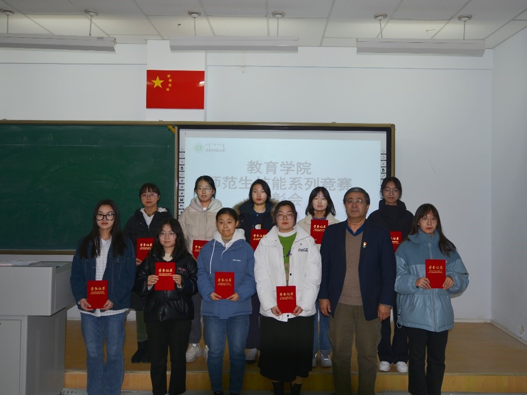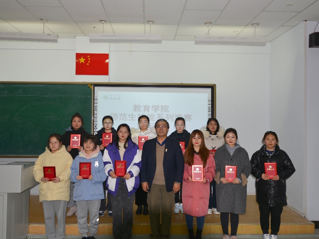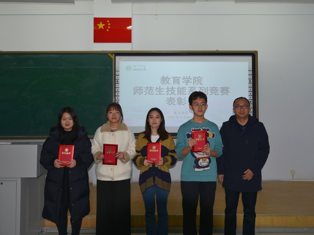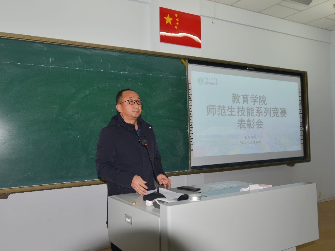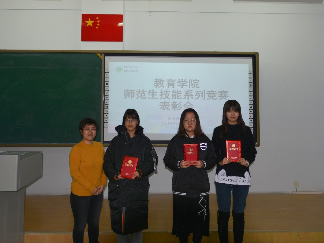 为构建以赛促练、赛练结合的师范生教学技能训练模式,加强师范生职业能力培养、加强高师范生职业能力培养、切实提升师范生的教学基本功与教学技能,有效落实教务处《关于举办第十届师范生教学技能竞赛、第二届本科生教具制作比赛、2021级师范类新生板书比赛的通知》《关于举办beat365正版唯一官网2021年大学生人文知识竞赛的通知》,11月30日下午,beat365正版唯一官网师范生技能系列竞赛表彰大会在盛乐校区行知楼309教室隆重举行。特邀beat365正版唯一官网铁木尔书记、边琦副院长,以及各专业、实践部、公共教研室和学工办的老师们,各班级获奖学生代表参加本次表彰大会。