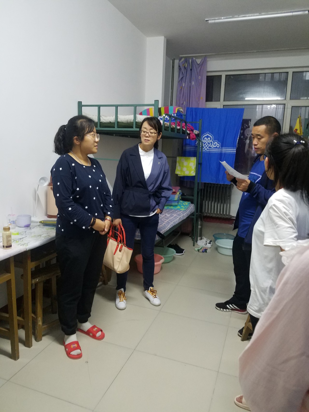 beat365官网党委副书记兼副院长王利教授,学工办于国佳老师、团总支孙悦老师、辅导员张玉老师、苏日娜老师以及部分学生干部走进新生宿舍。