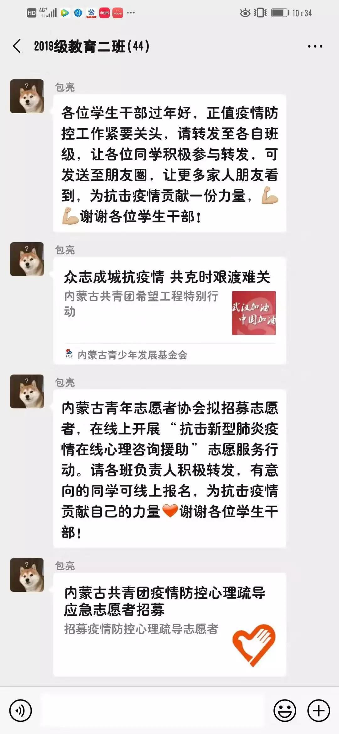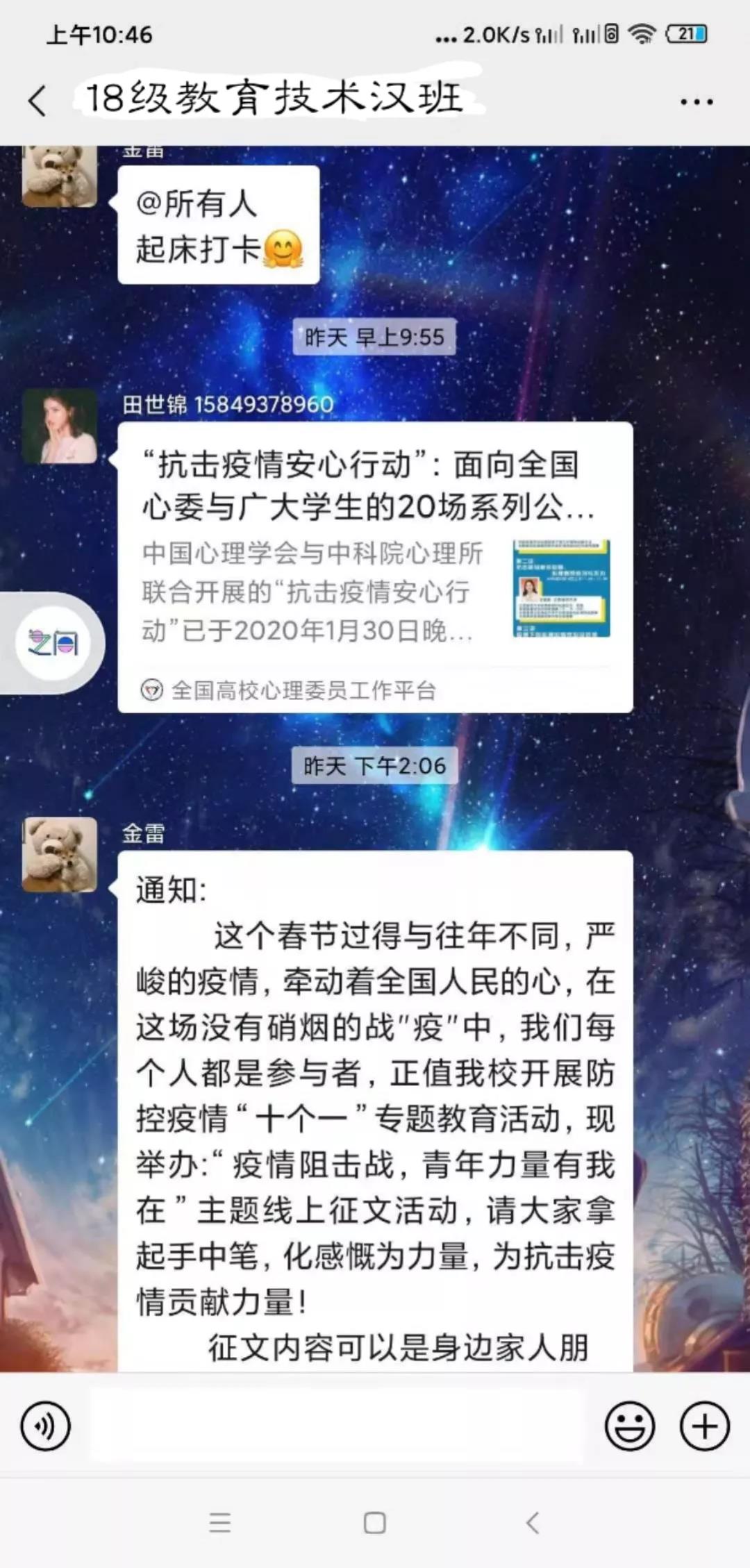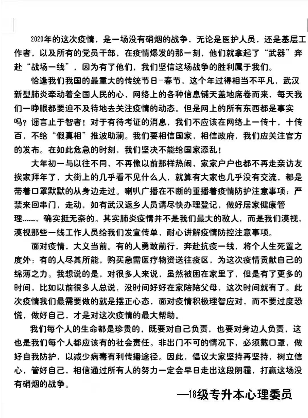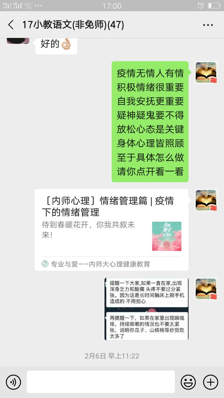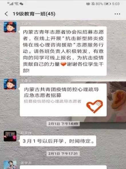 在这共克时艰的特殊时期,beat365正版唯一官网各班心理委员牢记自己的责任和使命,密切关注同学们的心理动态,积极对同学们进行心理辅导,转发心理疏导的相关文章,极大地缓解了同学们焦虑不安的心情。