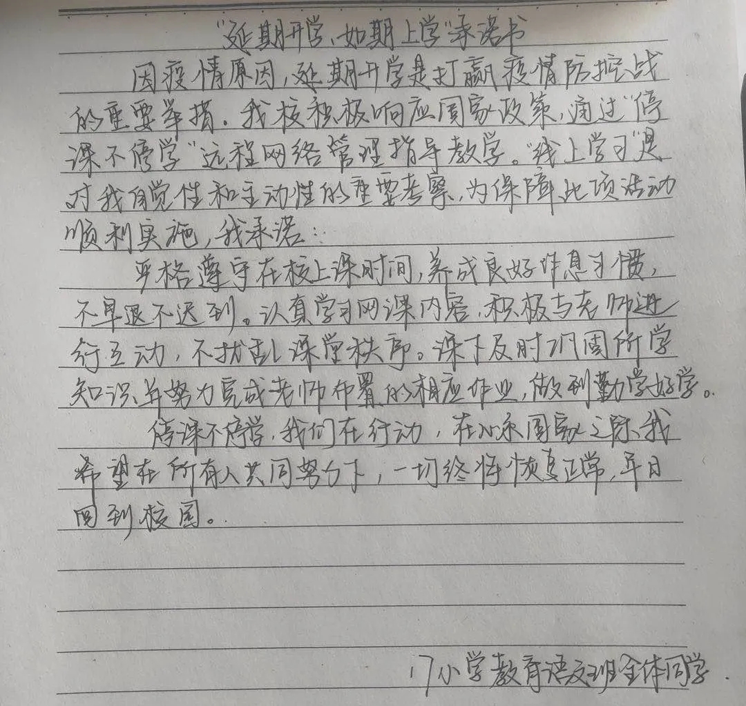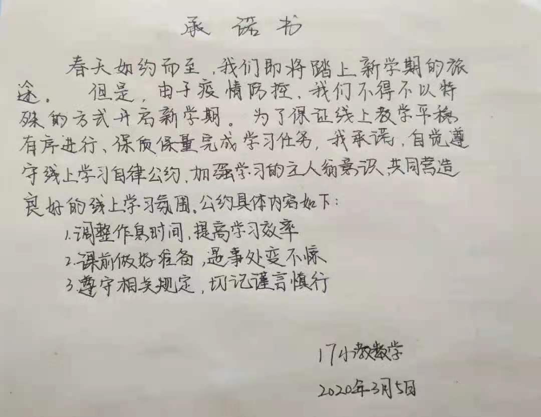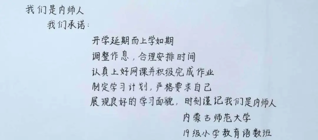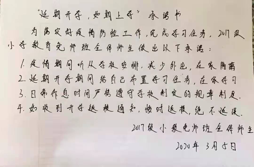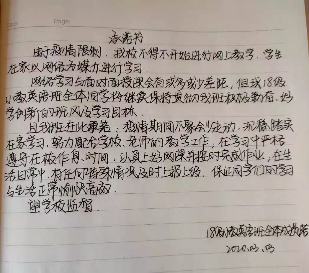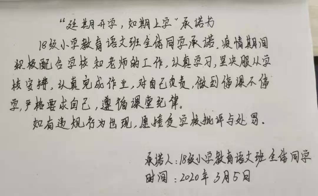 众志成城战疫情,齐心协力克时艰。为配合开展疫情防控的各项工作,凝聚师生共识,推动网络在线教学顺利进行,beat365官网组织开展网络承诺接力活动,同学们积极响应国家及学校号召,以笔为戈,以纸为戎,做出承诺,“停课不停学”,在知识中涵养自我,在行动中锤炼内心,在承诺中展现担当。