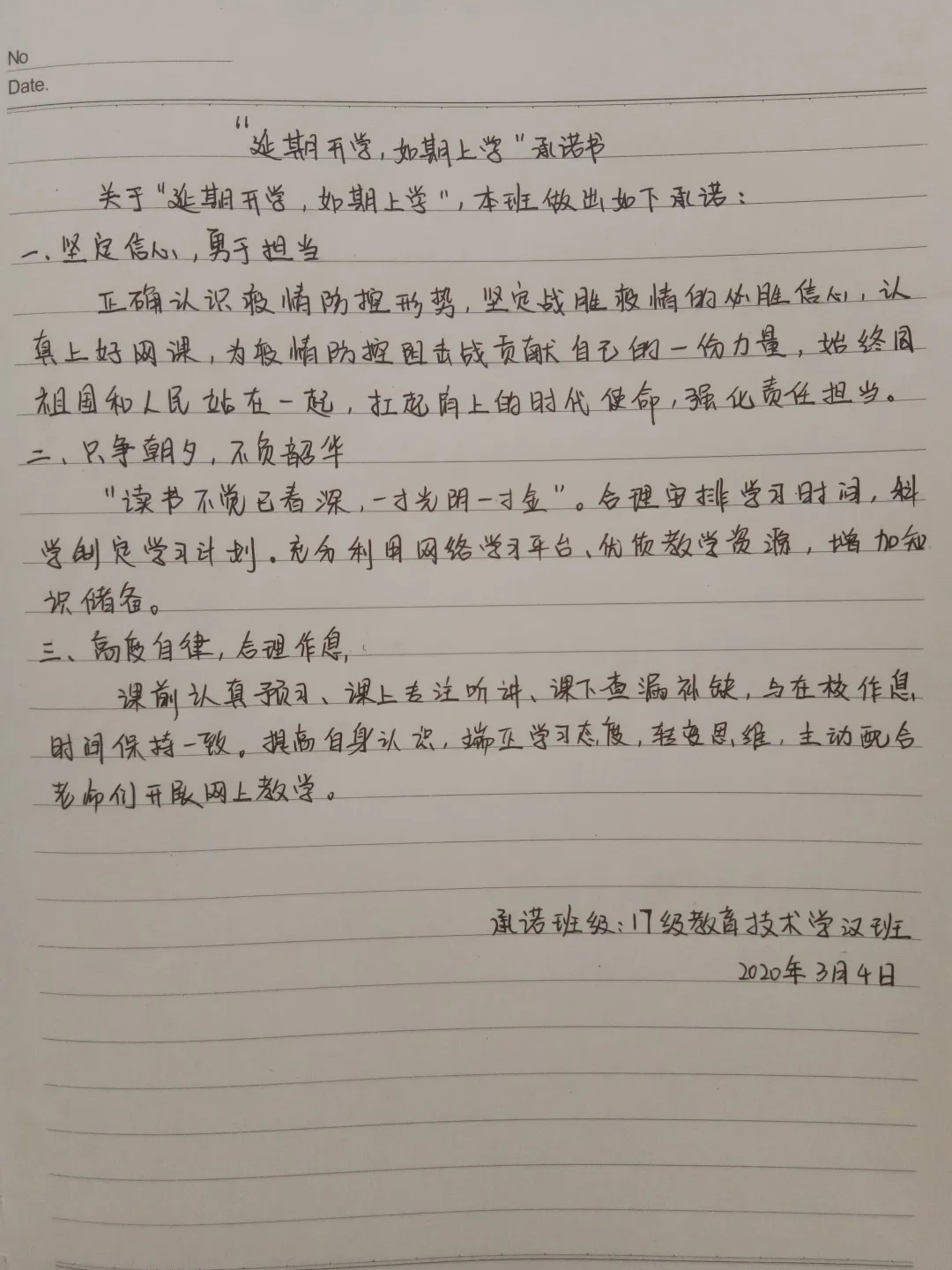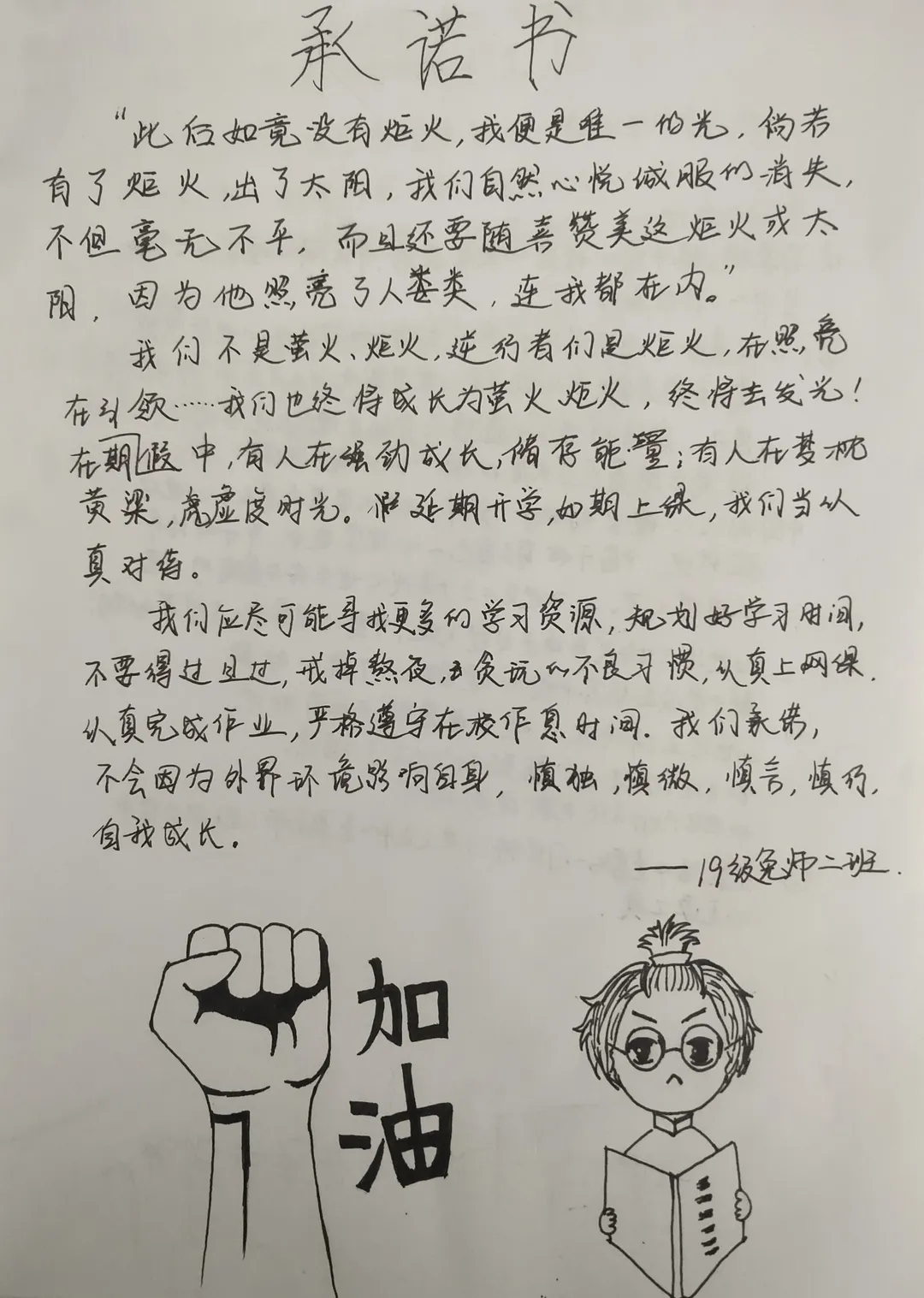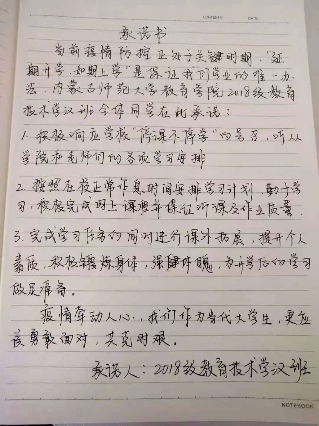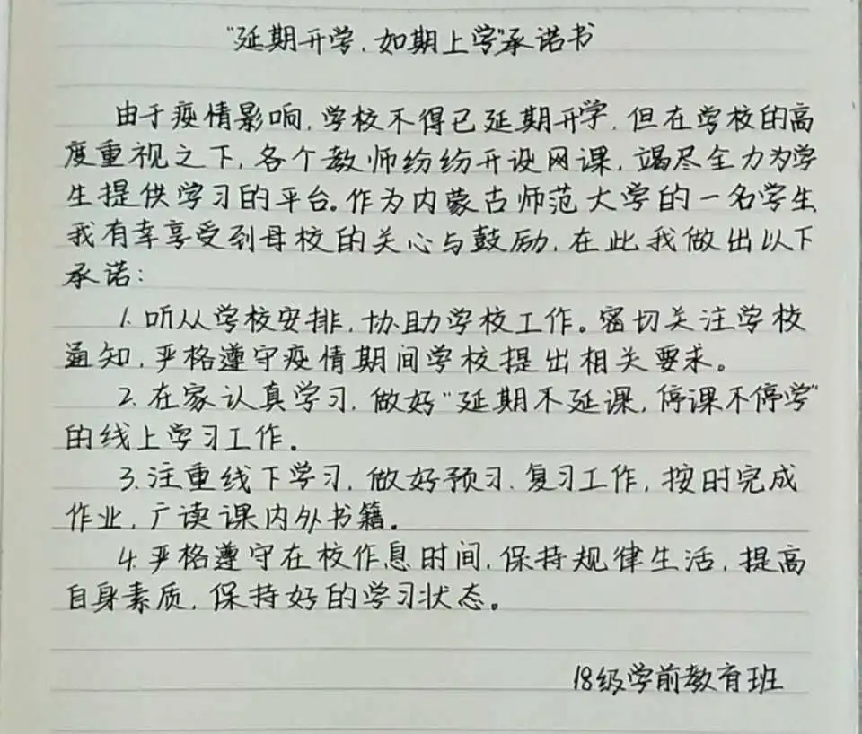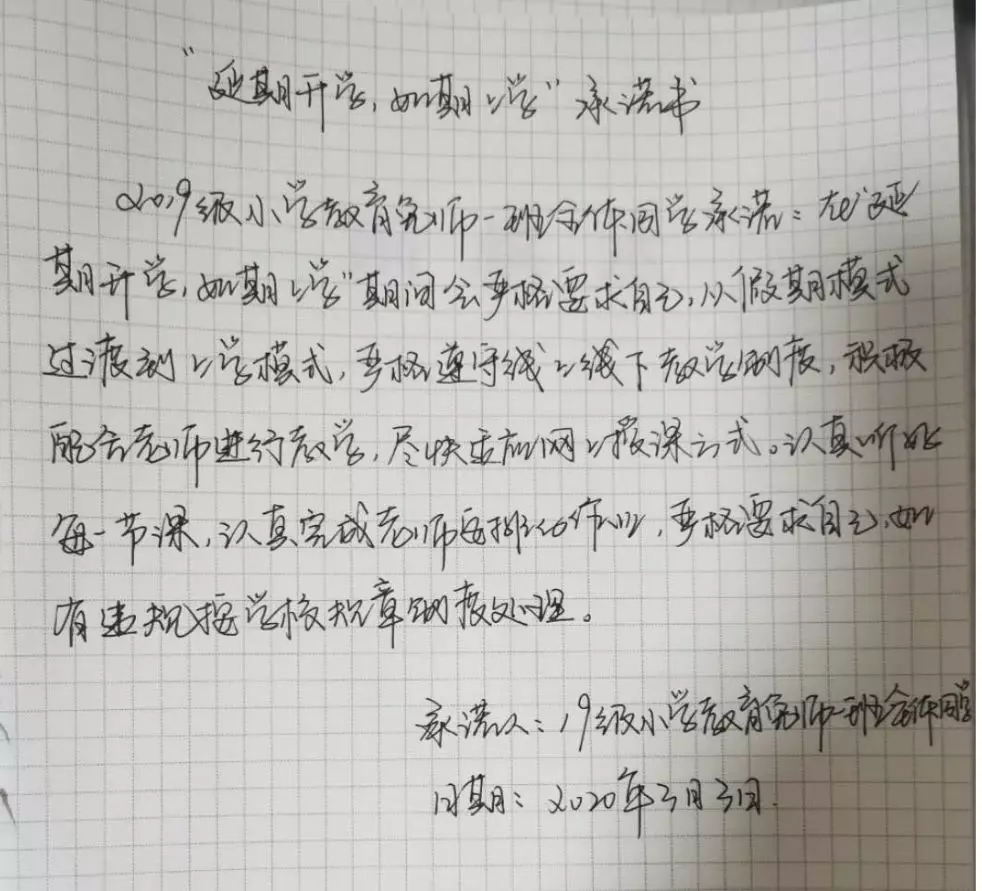 众志成城战疫情,齐心协力克时艰。为配合开展疫情防控的各项工作,凝聚师生共识,推动网络在线教学顺利进行,beat365官网组织开展网络承诺接力活动,同学们积极响应国家及学校号召,以笔为戈,以纸为戎,做出承诺,“停课不停学”,在知识中涵养自我,在行动中锤炼内心,在承诺中展现担当。