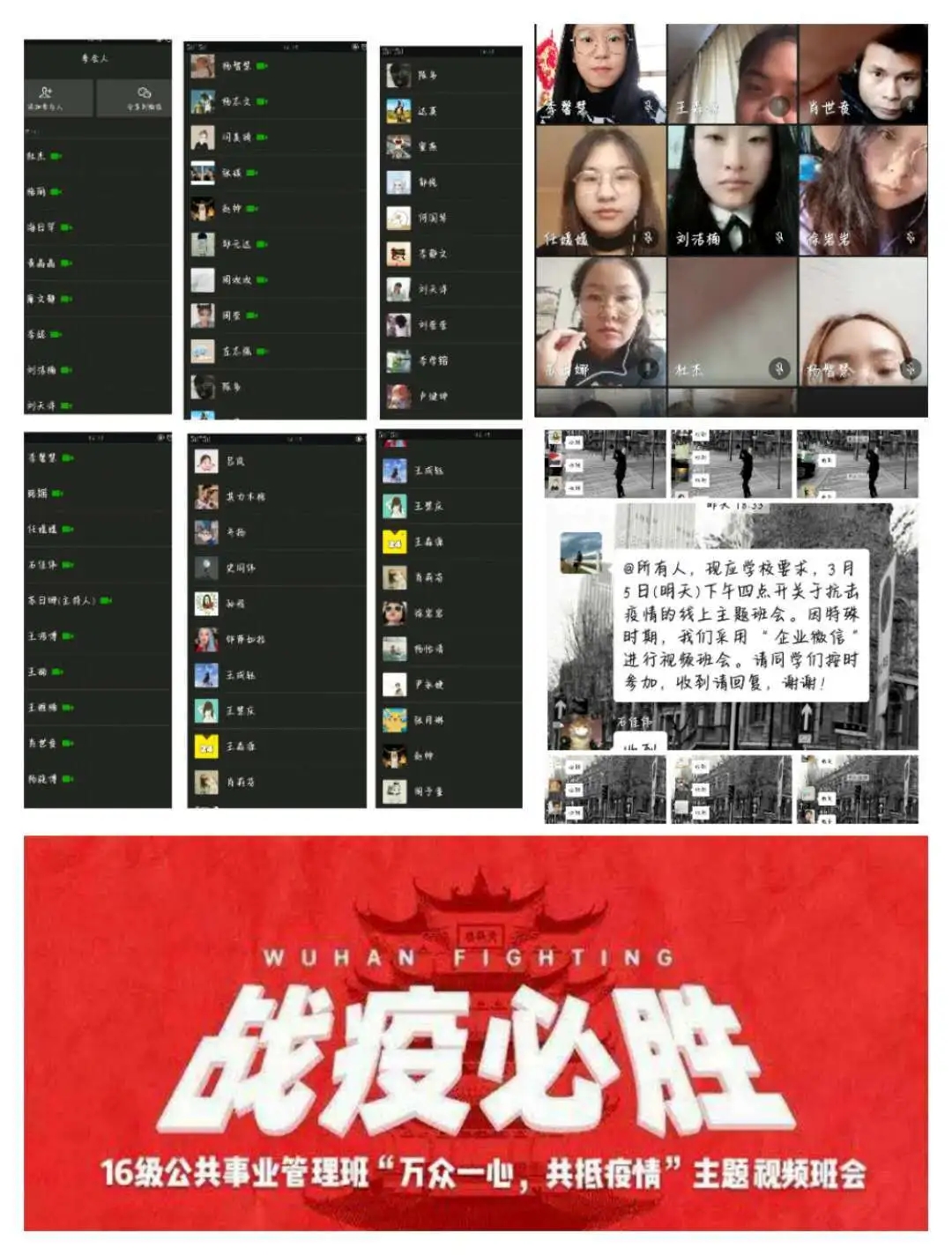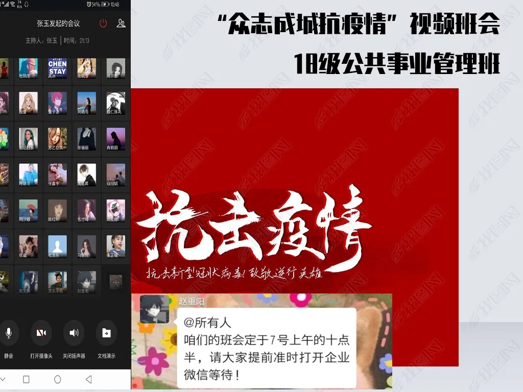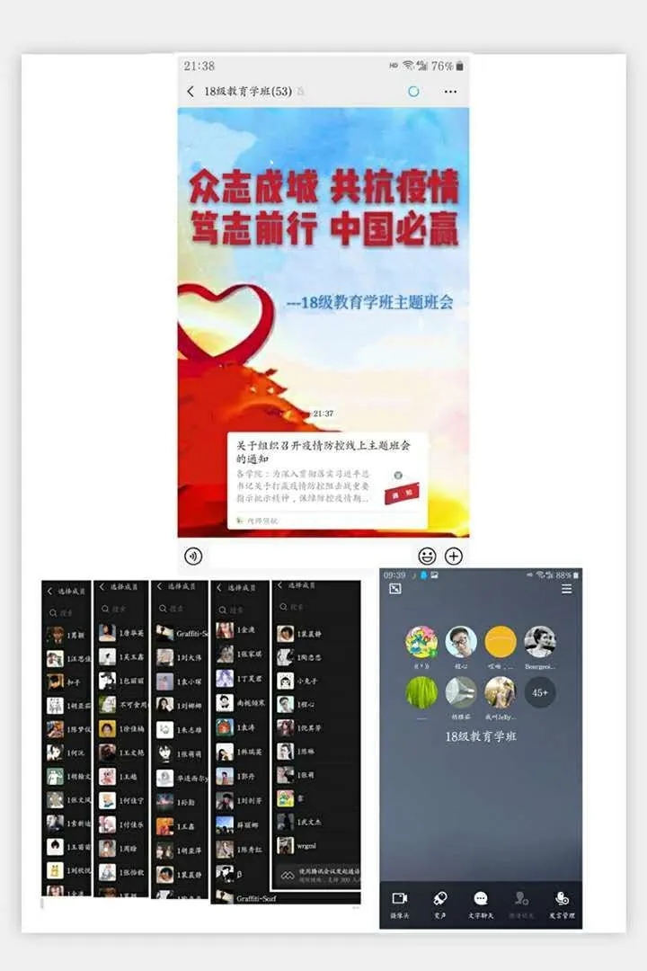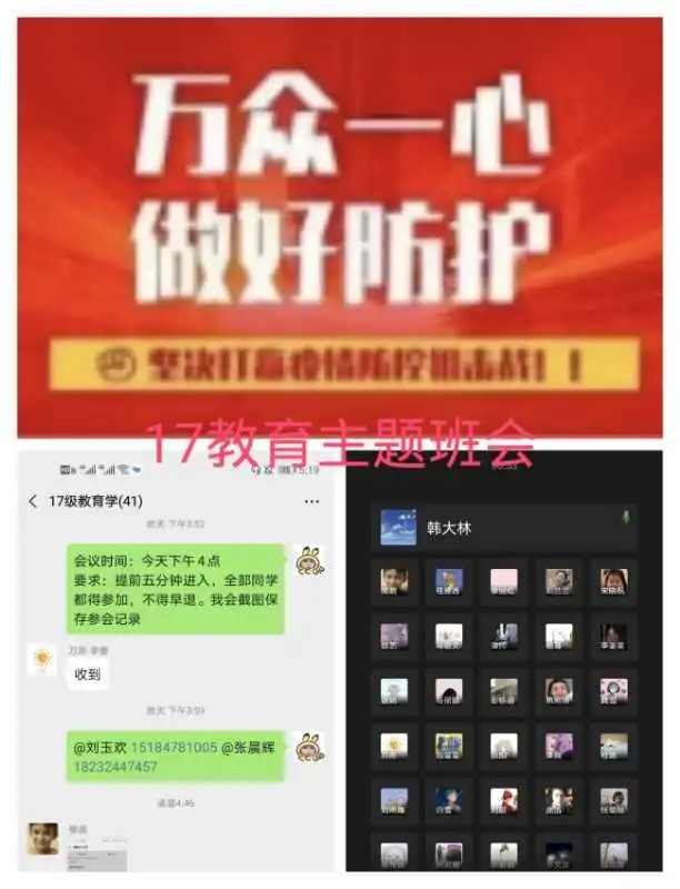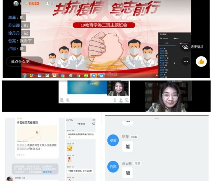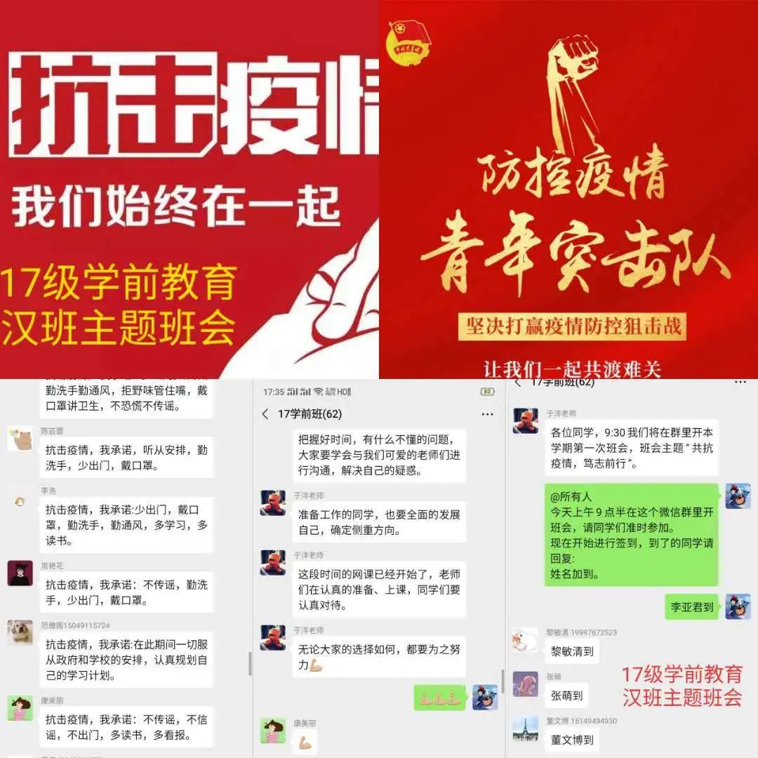 班会由各班班主任主持,充分利用企业微信、微信、QQ、钉钉等现代信息技术手段。班会内容主要围绕空中课堂我打卡、疫情防控我承诺、学霸养成我有招、生涯跨越任我行、排忧解难有我在五个方面展开,旨在按照“按期开课,延期返校”的原则,及时做好学生网络上课动员工作,明确网上教学安排和学习纪律,营造良好的网络学习学风;引导学生正确认识疫情 ,科学了解疫情;倡导学生严格遵守关于疫情防控的各项规定,每日定时在“健康情况日报系统”打卡,彰显当代大学生的责任与担当;激发学生们的学习积极性和主动性,共建团结和谐、健康向上的优良学风;就疫情当下毕业生面临的毕业论文答辩、考研复试、就业等问题,对毕业班学生进行深入细致的解答,开展精准指导服务;准确掌握班级学生思想动态、心理状况、学习生活情况,做好心理关怀。
