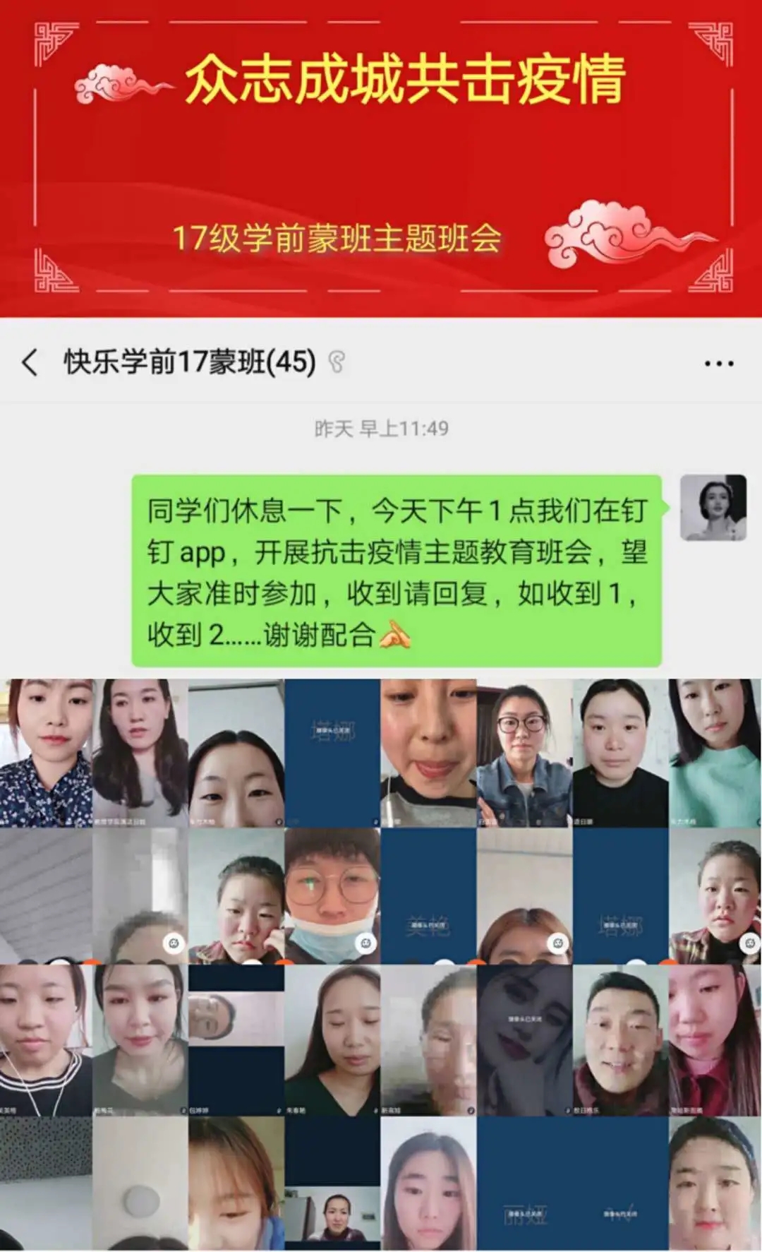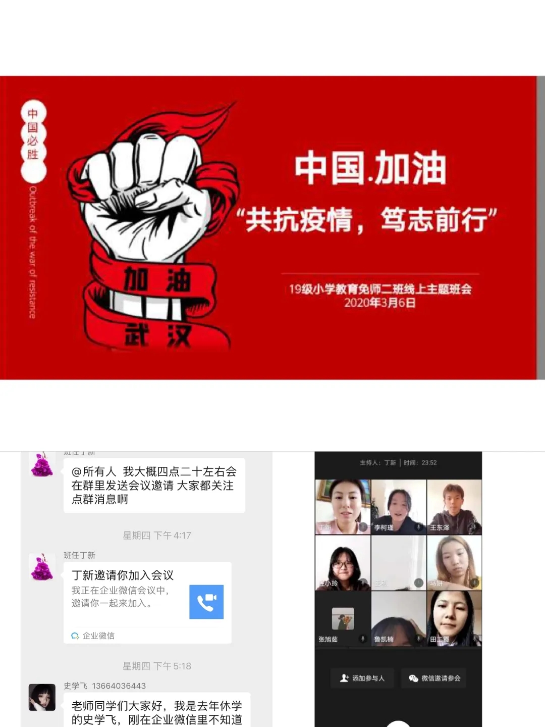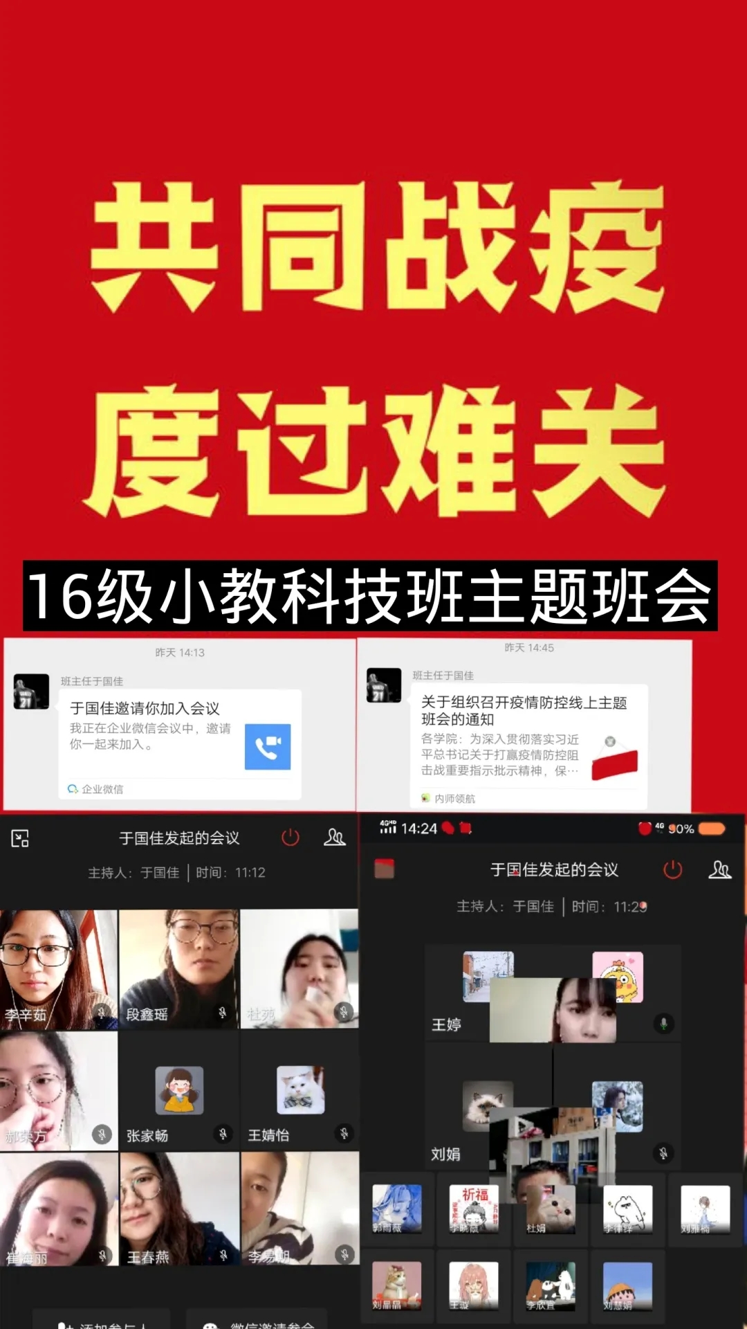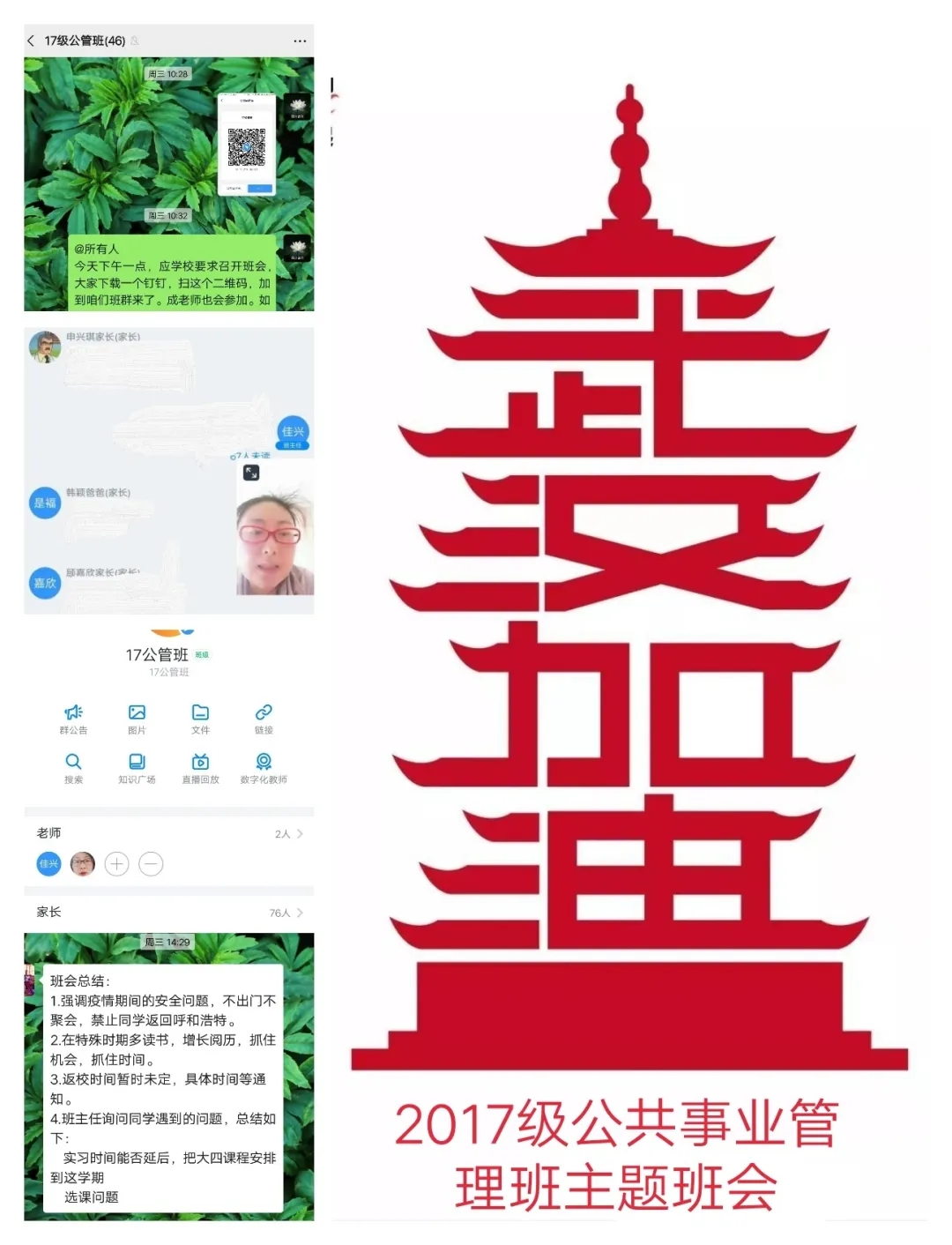 班会由各班班主任主持,充分利用企业微信、微信、QQ、钉钉等现代信息技术手段。班会内容主要围绕空中课堂我打卡、疫情防控我承诺、学霸养成我有招、生涯跨越任我行、排忧解难有我在五个方面展开,旨在按照“按期开课,延期返校”的原则,及时做好学生网络上课动员工作,明确网上教学安排和学习纪律,营造良好的网络学习学风;引导学生正确认识疫情 ,科学了解疫情;倡导学生严格遵守关于疫情防控的各项规定,每日定时在“健康情况日报系统”打卡,彰显当代大学生的责任与担当;激发学生们的学习积极性和主动性,共建团结和谐、健康向上的优良学风;就疫情当下毕业生面临的毕业论文答辩、考研复试、就业等问题,对毕业班学生进行深入细致的解答,开展精准指导服务;准确掌握班级学生思想动态、心理状况、学习生活情况,做好心理关怀。