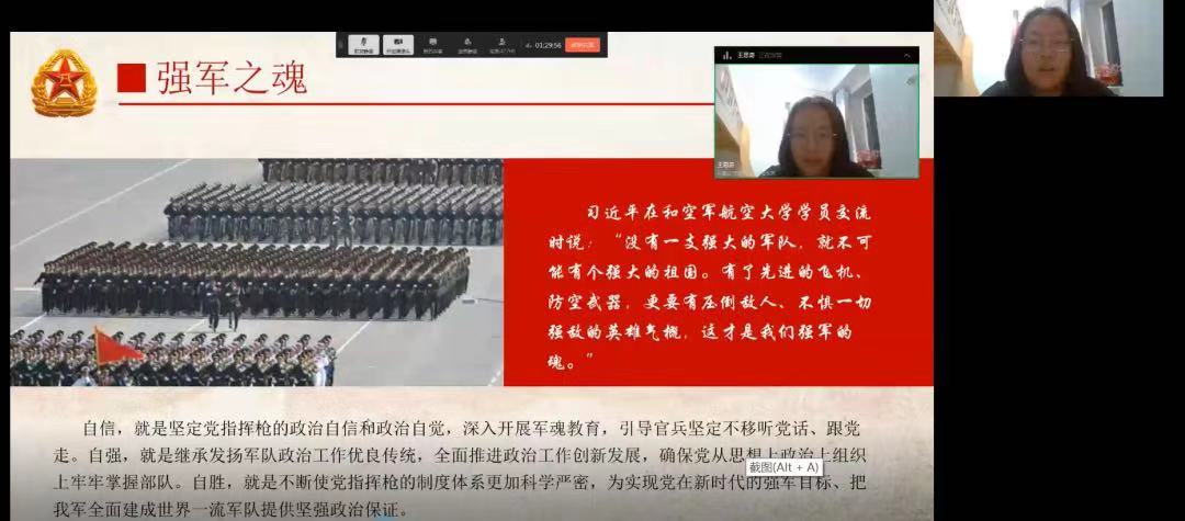 会议开始,张宏莹同学提到了我国的强军目标,她认为,只有建设一支听党指挥、能打胜仗、作风优良的人民军队,才能真正建设与我国国际地位相称、与国家安全和发展利益相适应的强大军队。接下来,王思奇同学谈到了强军之魂,人民军队坚持党对于军队的绝对领导,把这一条当作人民军队永远不变的军魂,是军队建设的根本原则、是中国特色社会主义的本质特征,也是党和人民对军队的根本政治要求。最后,王学博同学由一段视频引出了强军之要,他谈到,中国特色社会主义军事制度是坚持和完善一国两制”制度体系、推进祖国和平统一的坚强后盾,利于推动和构建人类命运共同体。