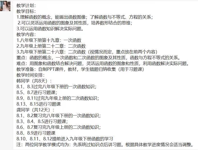 此次的教学对象是两位初二升初三的学生,教学的科目是数学。根据与两位家长以及学生的直接对接,了解到两位同学对数学学习的大体情况。两位同学情况大体一致,在几何、三角、方程等方面学习的还不错,唯一最大的问题就在于函数。函数贯穿了整个初中的数学知识,是初中最重要也是最难的一块,通常与圆一起结合出现在最后一个压轴题,函数也因此难到很多学生。