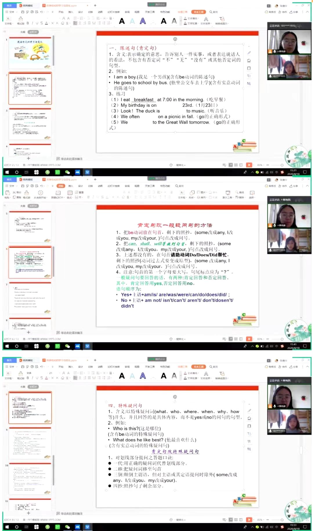 在上课前先复习了时态的相关内容,在讲解作业时发现廖同学在一般现在时第三人称单数变化时还有点区分不清,所以我通过习题和更进一步的讲解为她说明了单三的变化规律。今天学习的内容是英语句型及其变化,包括陈述句、否定句、一般疑问句和特殊疑问句。在讲解四种类型的句子时我都采用知识点+习题的方法,让她在听完知识点后可以及时的在习题中回顾。这几种类型我发现廖同学在肯定句变否定句时问题较大,所以我带着她一句一句分析,课后留下否定句作业来练习。同时在特殊疑问句中廖同学会把部分特殊疑问词混淆,我将知识点内容讲解完后发给她让她继续熟悉。廖同学在整个学习过程中态度积极,今天发现她对于这些内容掌握的较好,学习渐入佳境,希望她可以继续保持对英语的兴趣。
