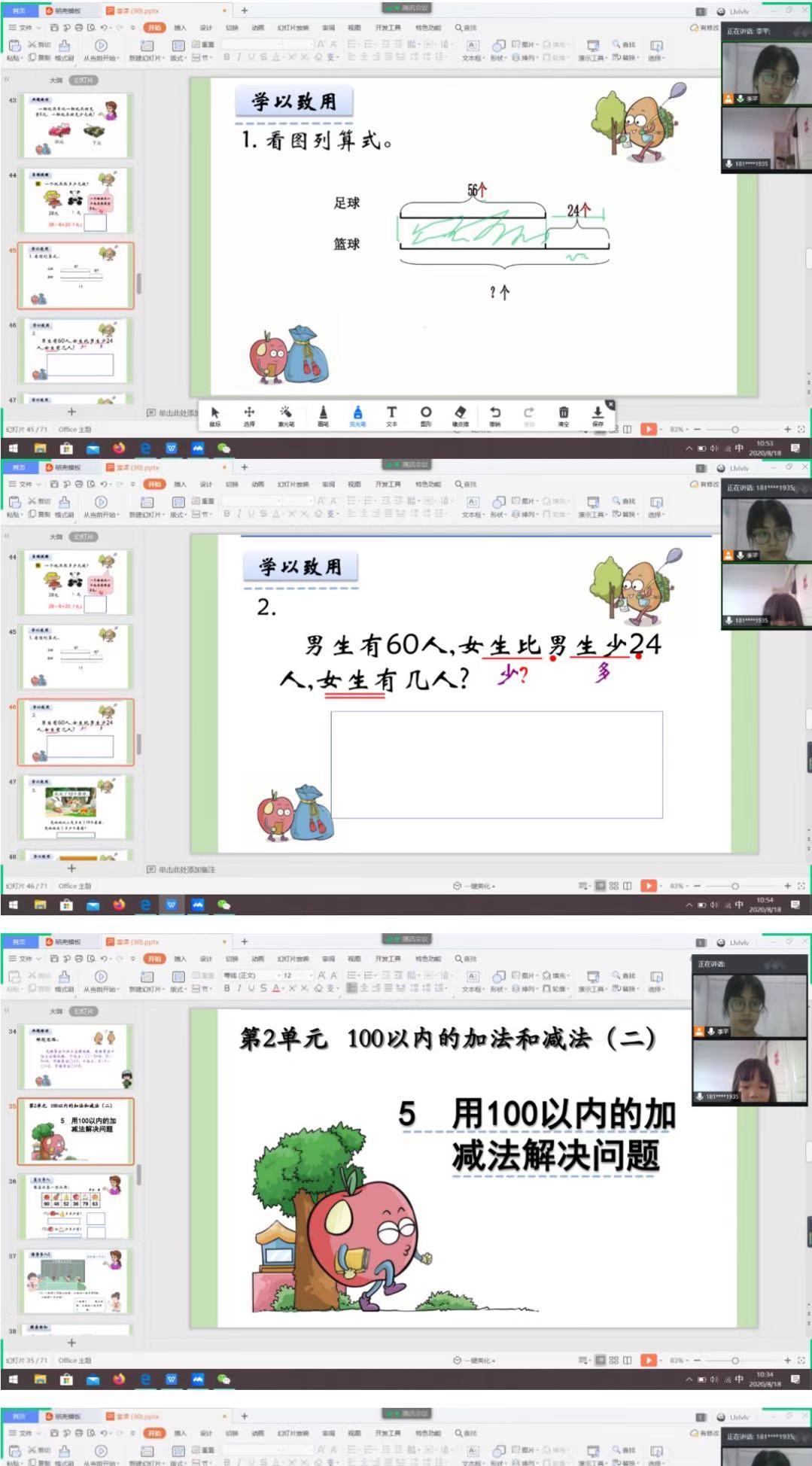 今天的内容是一百以内加减法的应用。学习目标是:①学会用加、减法解决‘比一个数多(少)几的数是多少’的实际问题。②尝试利用直观图来分析问题和解决问题。③在解决问题的过程中,理解数量间的关系,分清谁是大数,谁是小数。在学习过程中,我发现小廖同学在这方面掌握的很好,于是比我预计的速度要快了二十多分钟左右,于是我们提前进入了‘连加连减’的部分。目前小廖同学已经能基本掌握连加连减的计算方法及竖式的简便写法,并且能够正确的计算。