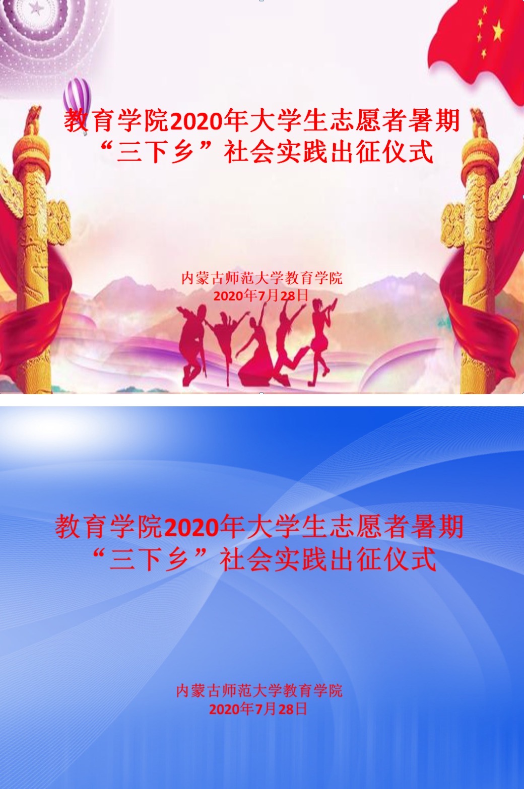 2020年7月28日晚上,beat365官网举办了暑期云端三下乡社会实践活动出征仪式。提前一天,我们信息技术指导组着手制作出征仪式所需定屏。我制作了两版初稿。