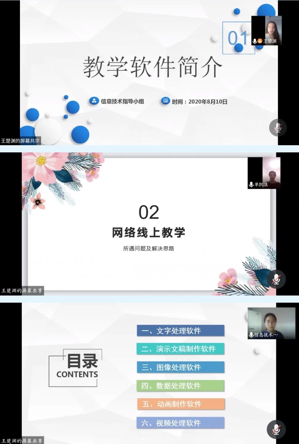 此次会议上,我宣讲的主题是网络线上教学所遇问题及解决思路。我将此主题分为六个部分进行讲解,分别是教学文件制作建议、教学视频录制方式、在线教学前准备、直播教学中意外出现中断怎么办、线上教学材料来源、常用软件介绍。细致分析、全面思考,尽心于解决线上问题,为此次云端三下乡做好后勤工作。
