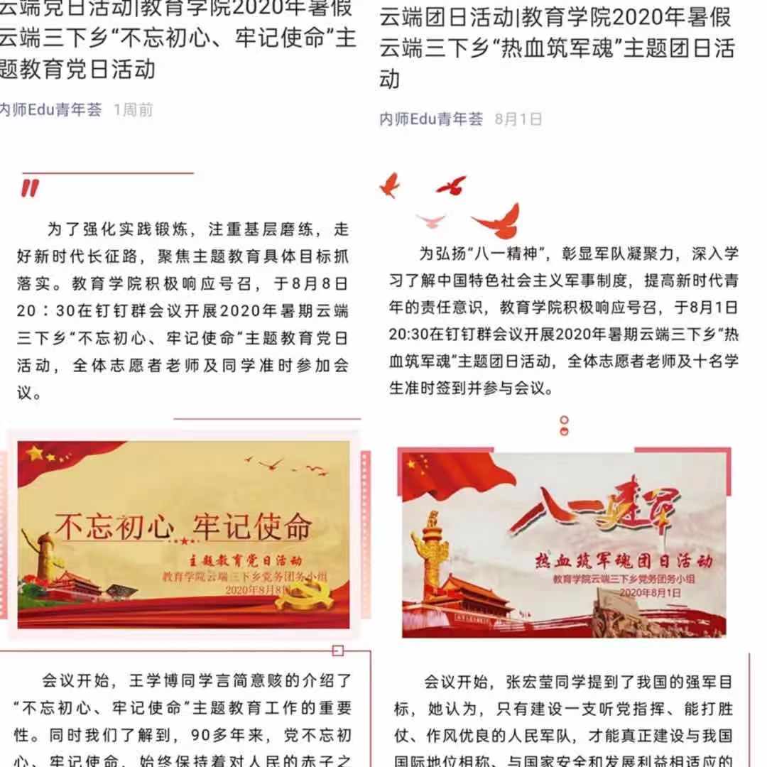 关于beat365正版唯一官网2020年的暑期云端三下乡活动,作为宣传报道组的成员,主要负责此次活动的宣传工作,收集、整合三下乡活动期间志愿者老师的教学工作和党团活动,并图文整合做成推送。这半个月以来,顺利出了5个推送,虽然不多,但受益匪浅。