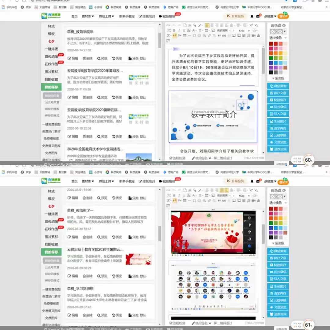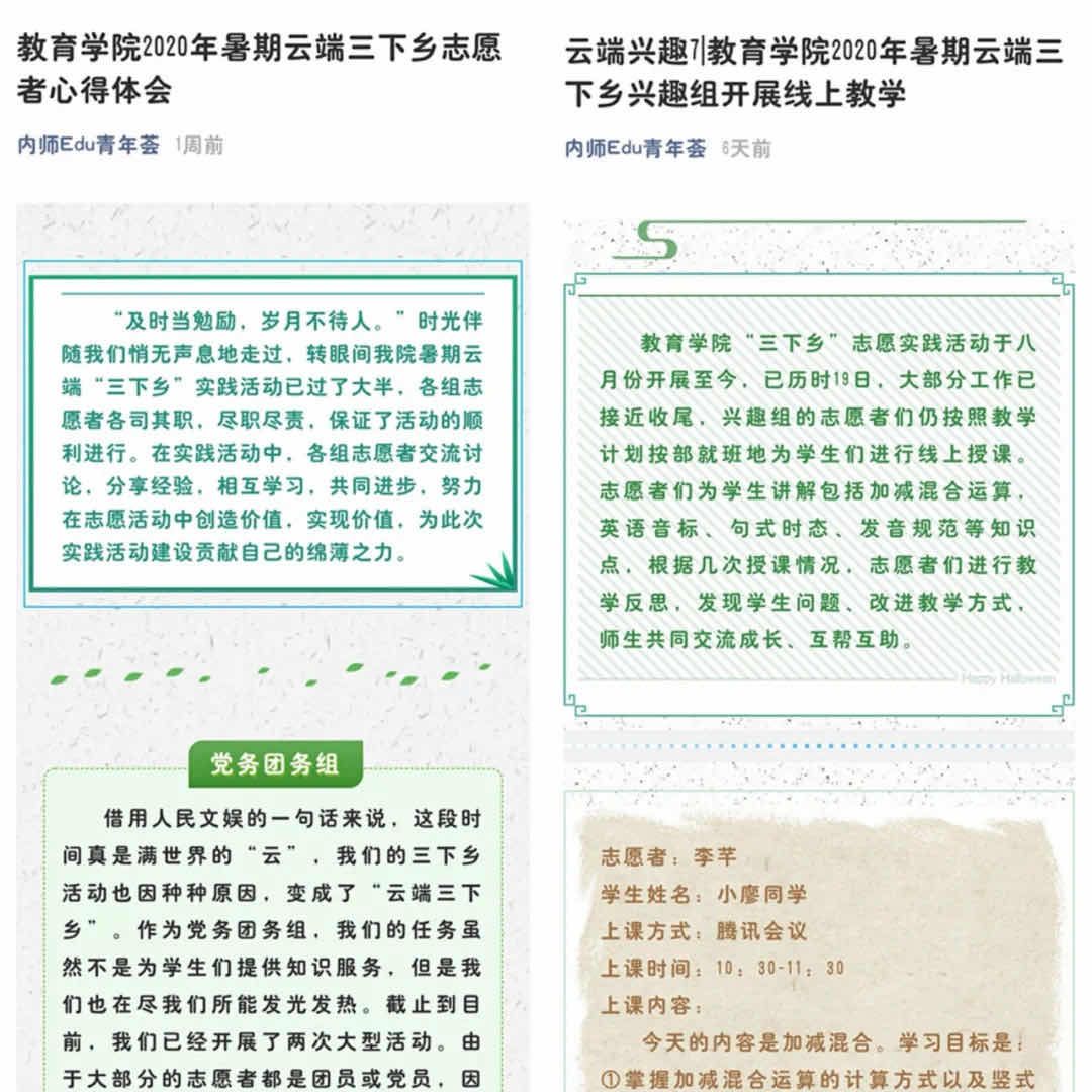 工作内容:整理教学实践部的图片和文字材料,并进行排版,制作学院公众号暑期三下乡相关推送。