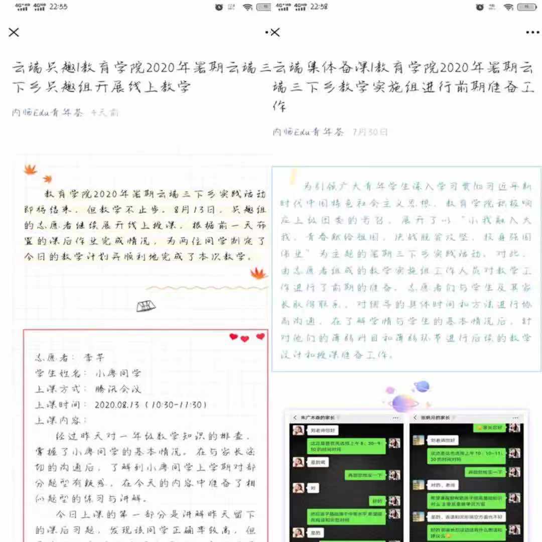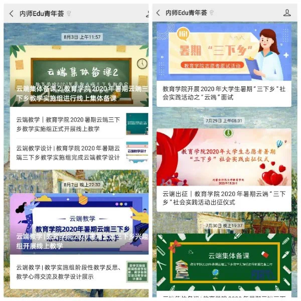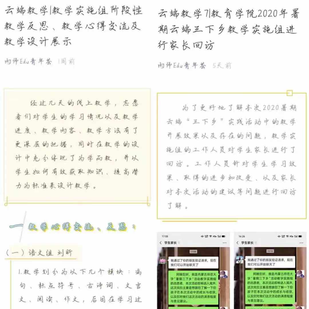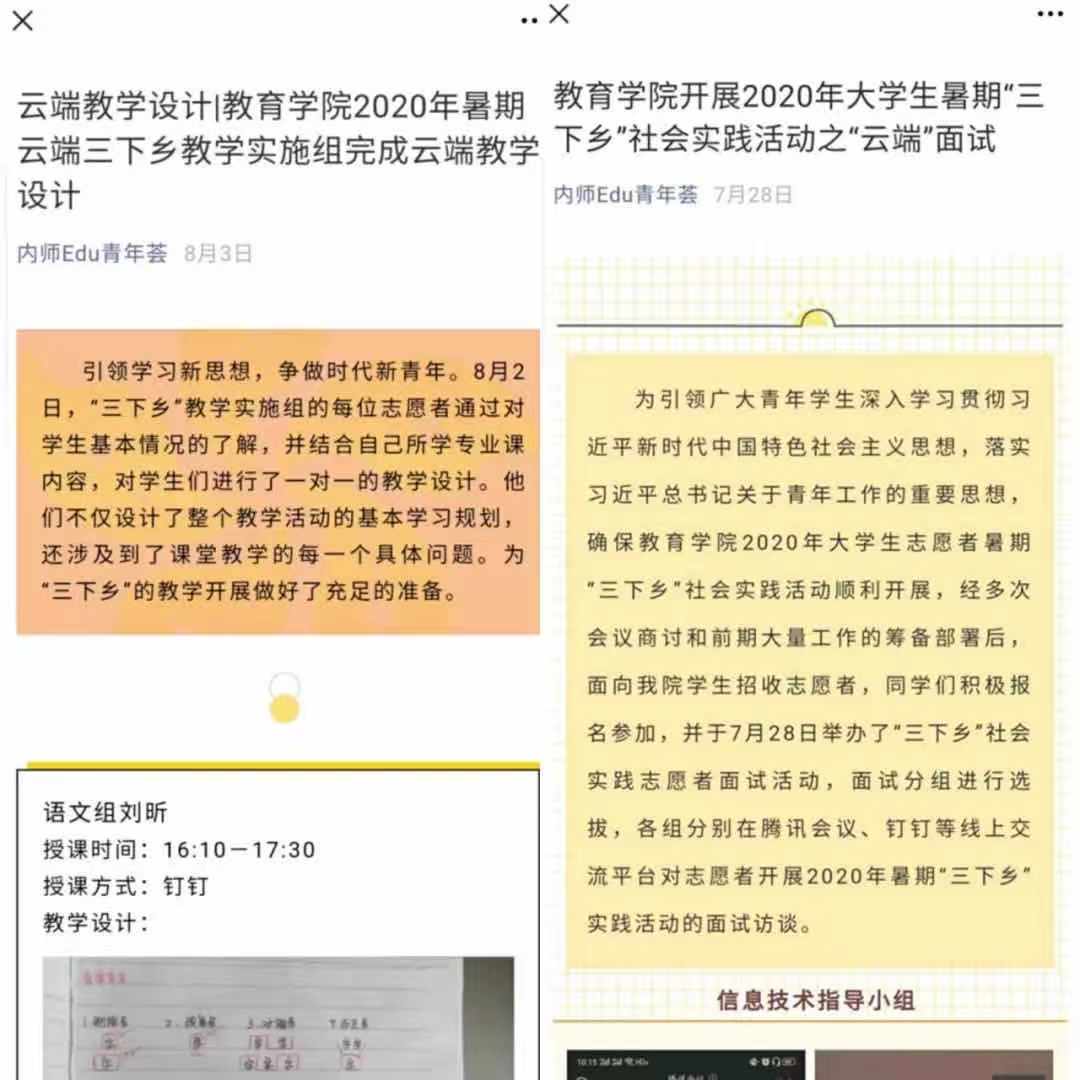 在本次暑期三下乡活动中,我作为宣传报道组的志愿者,主要工作是做公众号推送,为此次实践活动进行宣传报道。就是通过收集各组的汇报总结,进行加工和整合,以公众号的形式展现出来。我们在合理得当的安排与合作中顺利完成了所有的工作任务,我在这次活动中共做了5个推送,包括云端面试、云端教学设计、云端教学、云端教学6、云端兴趣4。