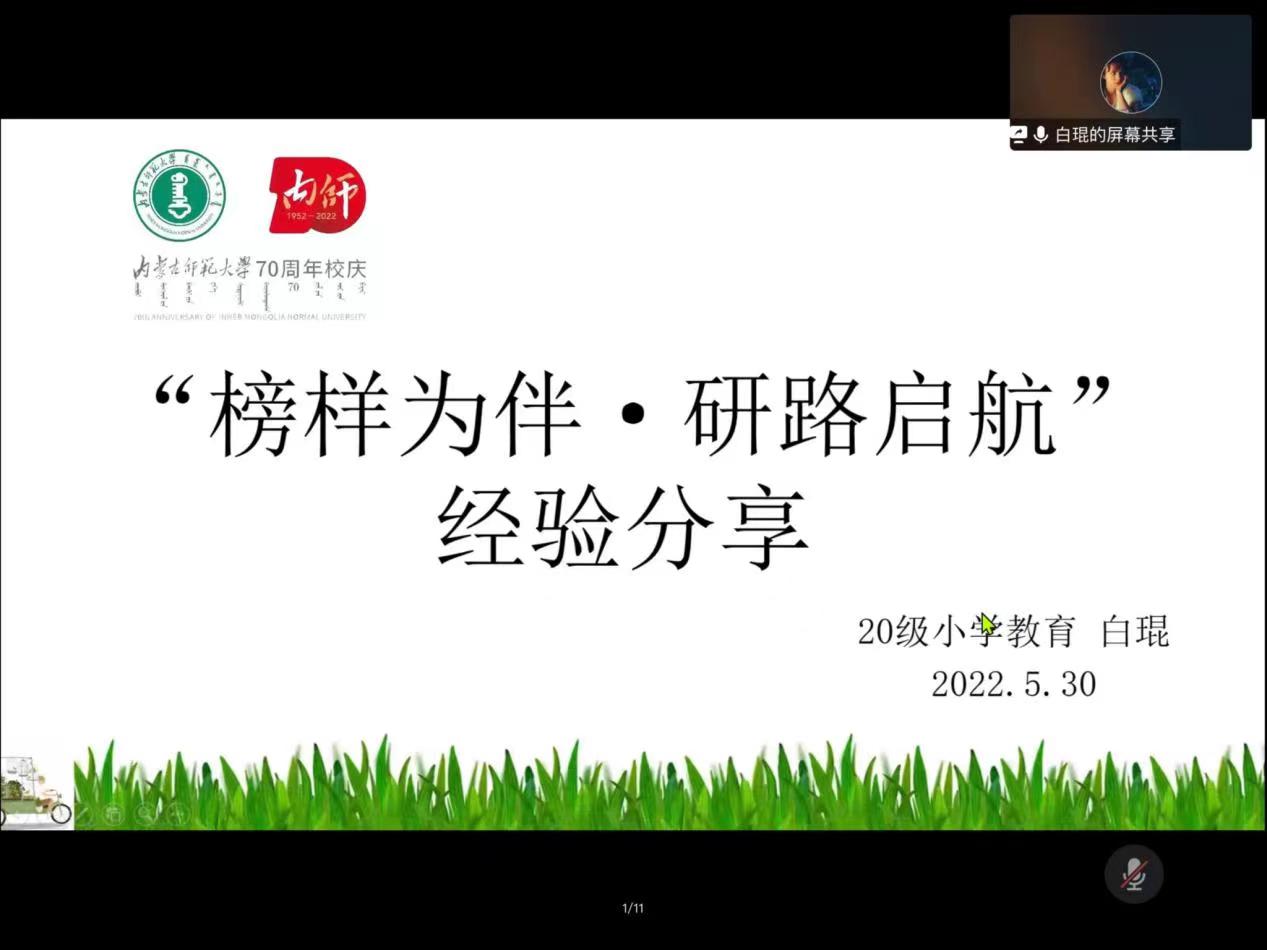 为充分发挥优秀学子的示范引领作用,激励研究生笃学慎思、锐意进取,beat365正版唯一官网于2022年5月30日19:00线上开展了主题为“榜样为伴,研路起航”研究生国家奖学金获得者事迹宣传活动,邀请2021年国家奖学金获得者马瑞萍、白琨两位同学进行分享交流。参与此次活动的有学院党委副书记、副院长斯琴满都呼、副院长赵荣辉、研究生教学秘书赵元韬和学院全体研究生及部分本科生。