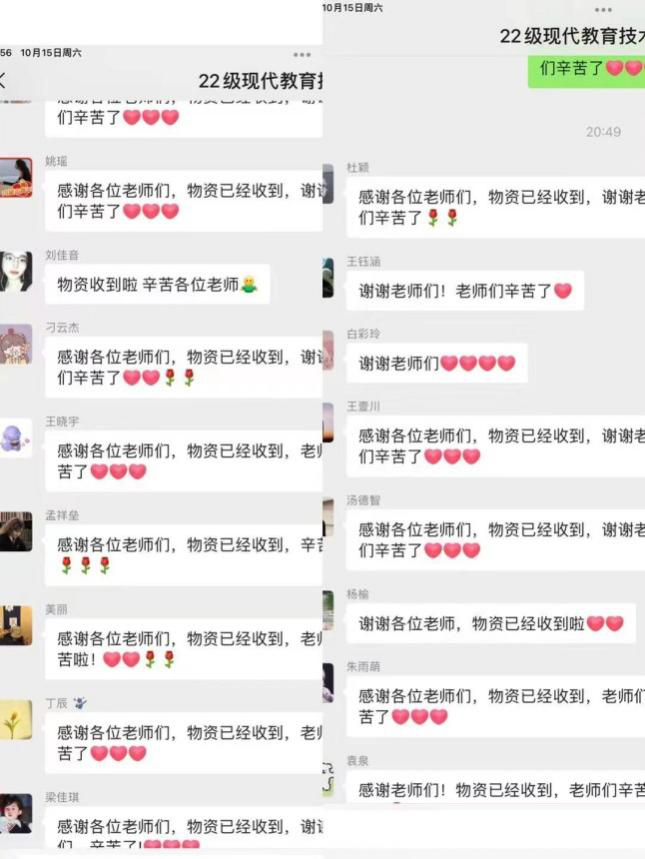 2022年10月15日,在beat365正版唯一官网党委领导下,教育技术学教师支部组织专项活动解决学生生活急需。党员教师在了解学生目前急需的生活用品后,第一时间积极联系身边资源,确定供货和送货渠道并完成采购,随后在学校相关保障人员的配合下,经学院驻赛罕校区领导赵荣辉副院长组织志愿者送货上楼,将一批紧缺物资送到赛罕校区部分教育硕士研究生手中。这些平日里不起眼的东西,此时正是“礼轻情意重”。学生们通过微信群表达了对老师们的谢意。