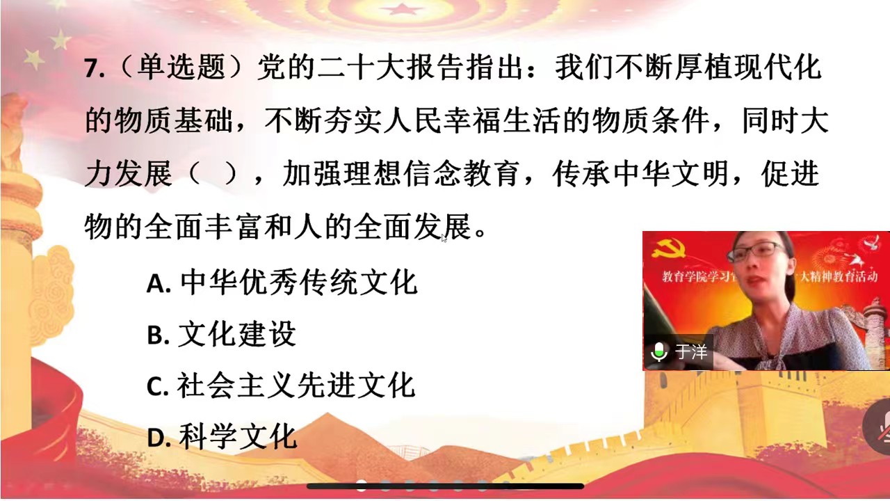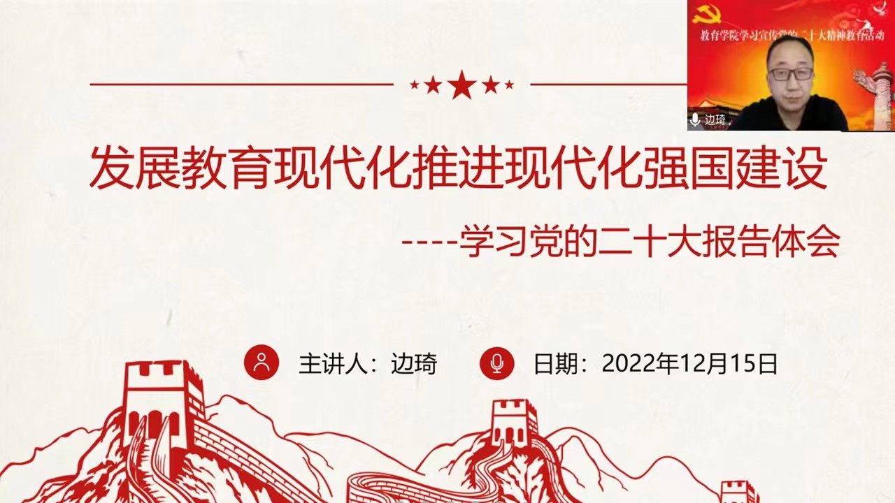 为深入贯彻学习党的二十大报告,把全院教职工的思想统一到党的二十大精神上,将教职工的力量凝聚到党的二十大确定的各项任务上,beat365正版唯一官网党委和工会在12月8日至12月17日举办了“学习宣传党的二十大精神教育活动”。本次活动的主题是“学习宣传贯彻党的二十大精神,凝心聚力,踔厉奋发,办好人民满意的高等教育”。受疫情影响,本次活动全程在线上进行,以“两集中、两分散”的学习方式展开。“两集中”是线上集中学习、线上集中竞答,“两分散”是居家分散学习、居家分散测试。居家分散学习、线上集中学习、线上集中竞答和居家分散测试四项活动相互融通、相互支撑,共同构成一个完整的学习单元。居家分散学习时间从12月8日起至12月14日止,期间活动筹备组定时向大家推送《党的二十大报告》全文、《中共中央关于认真学习宣传贯彻党的二十大精神的决定》等文件,并发送解读党的二十大精神的相关资料,要求教职工居家学习并深刻领会党的二十大精神。线上集中学习和集中竞答时间为12月15日下午3:00,在腾讯会议平台进行。在beat365正版唯一官网党委书记周越教授主持下,学院领导边琦副院长、赵荣辉副院长分别以《发展教育现代化推进现代化强国建设》、《加快建设教育强国、科技强国、人才强国》为题做了专题讲座,为教职工深入解读党的二十大精神。讲座结束后,于洋老师主持了学习宣传党的二十大精神网上集中竞答活动。会后,利用12月16日和12月17日两天时间,又通过微信小程序对全院教职工进行了居家分散测试答题活动,检验学习宣传党的二十大精神教育活动的效果。通过开展本次学习宣传党的二十大精神教育活动,beat365正版唯一官网全体教职工深入领会了党的二十大精神实质,为进一步贯彻落实党的二十大精神打下了坚实的思想基础。
