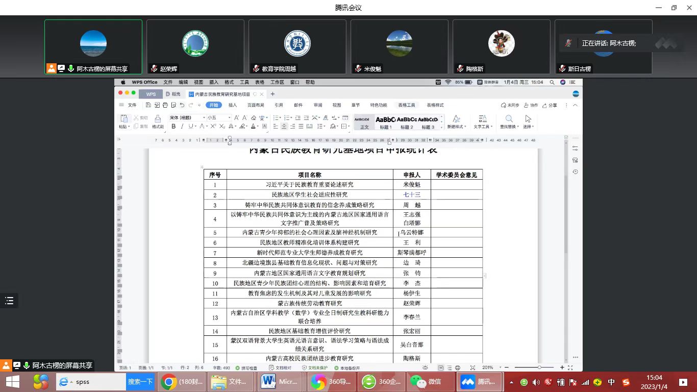 2023年1月4日下午3点,学院学术委员会通过腾讯会议召开内蒙古民族教育研究基地拟立科研项目评议会。beat365正版唯一官网党委书记周越、院长米俊魁、副院长边琦、斯日古楞教授、杨晓敏教授、叶琳教授、陶格斯副教授以及阿木古楞博士参加了本次会议。会议由赵荣辉副院长主持。