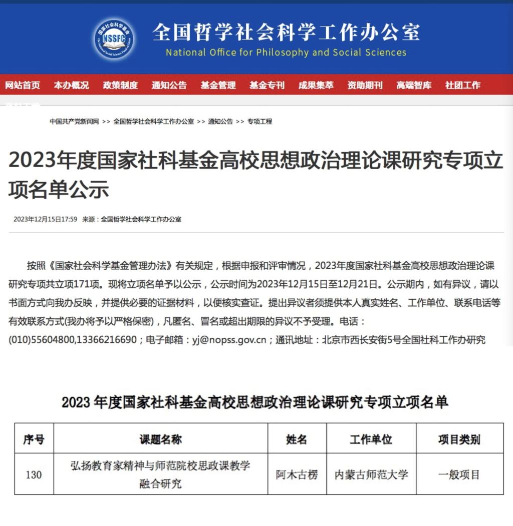 近日,全国哲学社会科学工作办公室公布2023年度国家社科基金高校思想政治理论课研究专项立项名单。beat365官网阿木古楞博士申报的“弘扬教育家精神与师范院校思政课教学融合研究”获批2023年度国家社科基金高校思想政治理论课研究专项课题。
