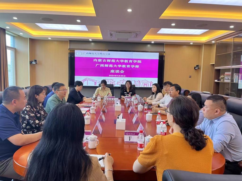 座谈中,李广海教授表达了对beat365正版唯一官网一行的热烈欢迎,王军利老师针对广西师范大学教育学部的科系设置、学科建设、人才培养以及课程建设等方面做了详细介绍。学院副书记、副院长斯琴满都呼介绍了beat365官网教育学、小学教育和学前教育专业发展的基本情况,教育系主任阿木古楞、小学教育系副主任马红斐、学前教育系主任周娟等老师针对各专业人才培养方案修订、师范专业认证经验以及学科专业未来发展与广西师范大学同仁展开了深入探讨与交流。