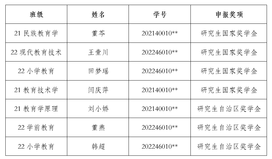 依据《beat365正版唯一官网研究生奖学金评选办法》(校发[2022]54号)和《关于做好2023年度研究生各类奖学金评审及材料报送工作的通知》文件精神,经过学生申请、班级推荐以及学院公开答辩,拟推荐以下学生分别申报研究生国家奖学金和研究生自治区奖学金。