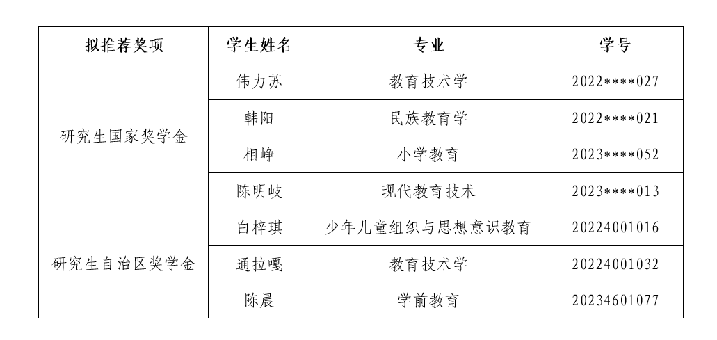 依据《beat365正版唯一官网研究生奖学金评选办法》(校发[2022]54号)和《关于做好2024年度研究生各类奖学金评审及材料报送工作的通知》文件精神,经过学生申请、班级推荐以及学院公开答辩,拟推荐以下学生分别申报研究生国家奖学金和研究生自治区奖学金。